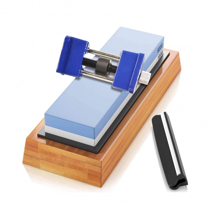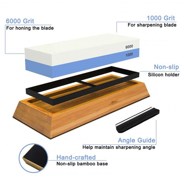 The whetstone set includes double-sided grinding stone, silicone holder, bamboo base, angle guide and honing guide. It is suitable for cutter sharpening of home kitchen or woodworking.