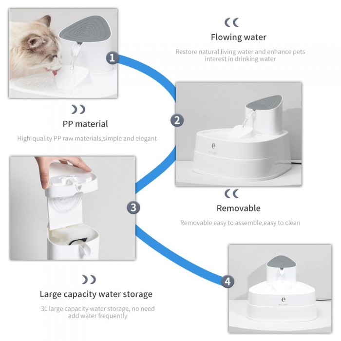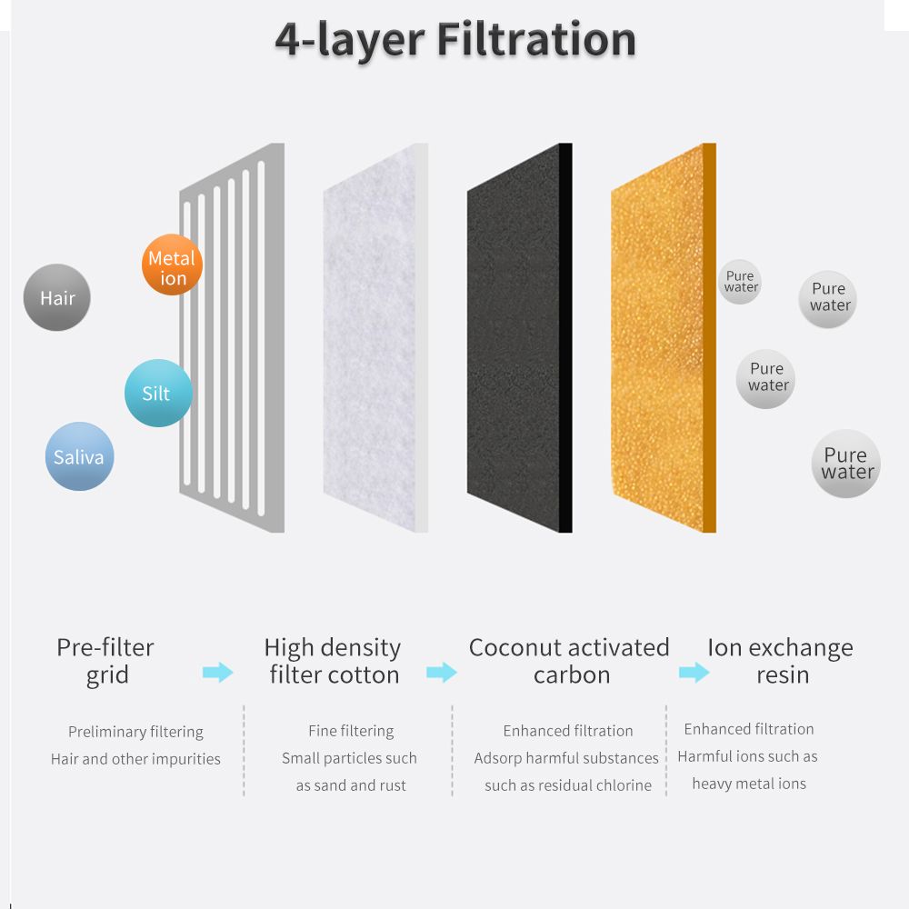 4-Layer Filtration: Water quality can be improved by 4-layer filtration. The filtration captures hair, small particles, and debris, etc. Filtration can assure water quality and enhance the taste of fresh water for your cats.