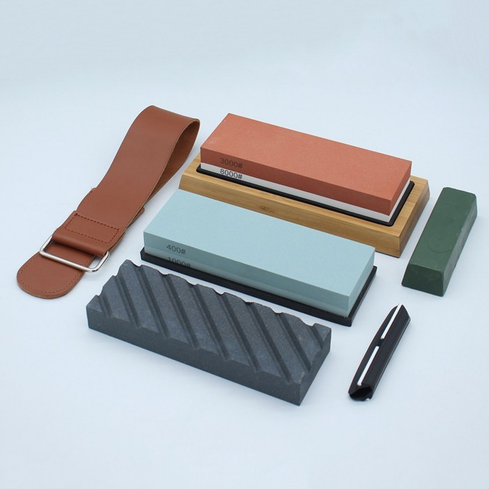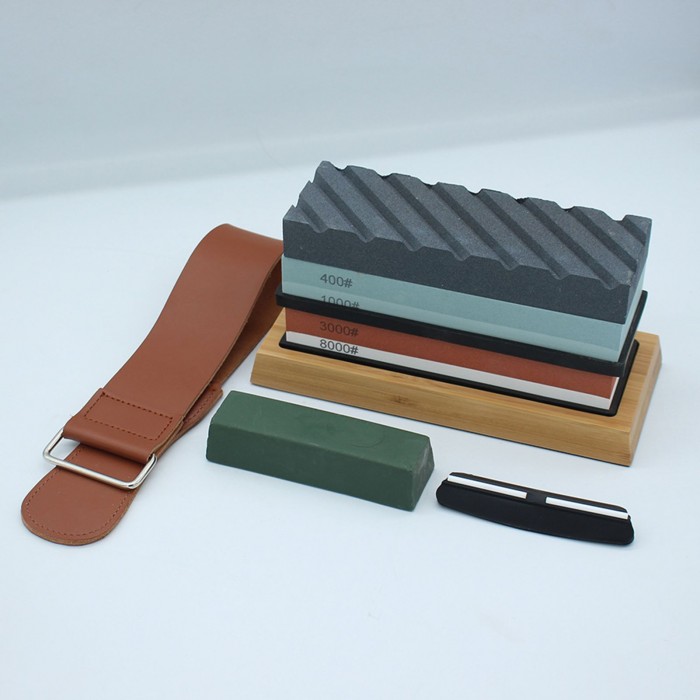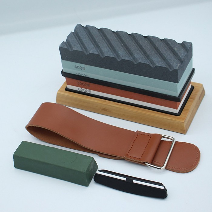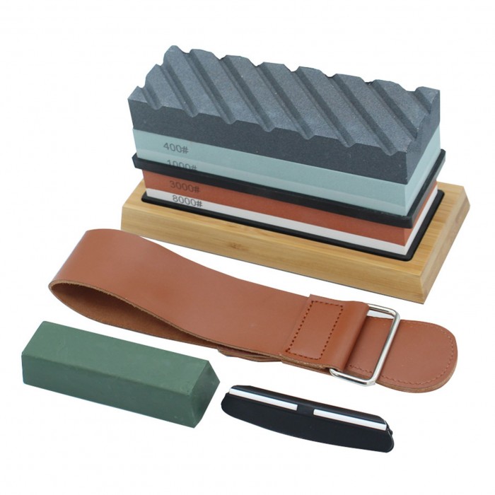 The whetstone set includes flattening stone, double-sided grinding stone, silicone holder, bamboo base, leather strop, green polishing wax and angle guide. The kit is professional and practical to sharpen any blade.