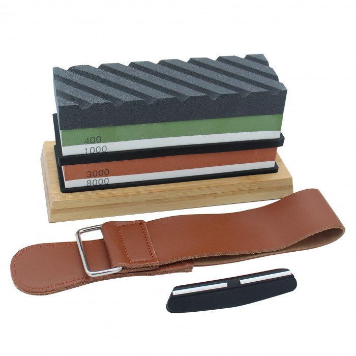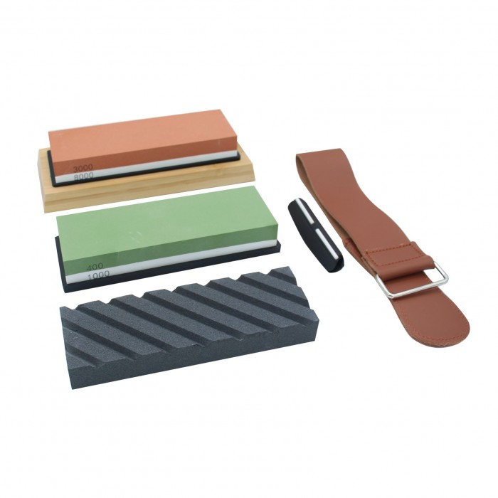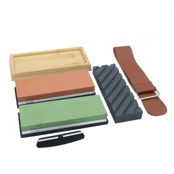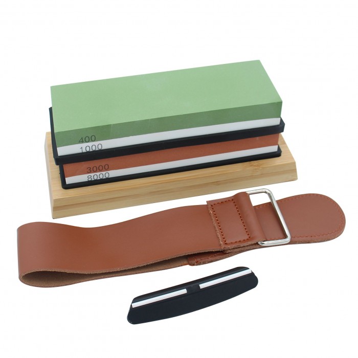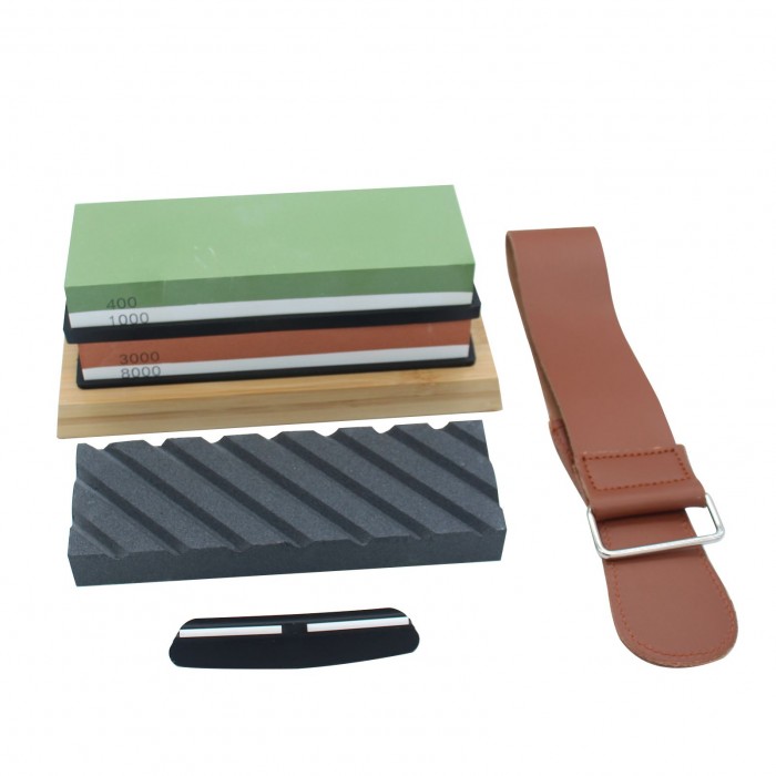 The whetstone set includes double-sided grinding stone, silicone holder, bamboo base, leather strop, flattening stone and angle guide. The kit is professional and practical to sharpen any blade.
