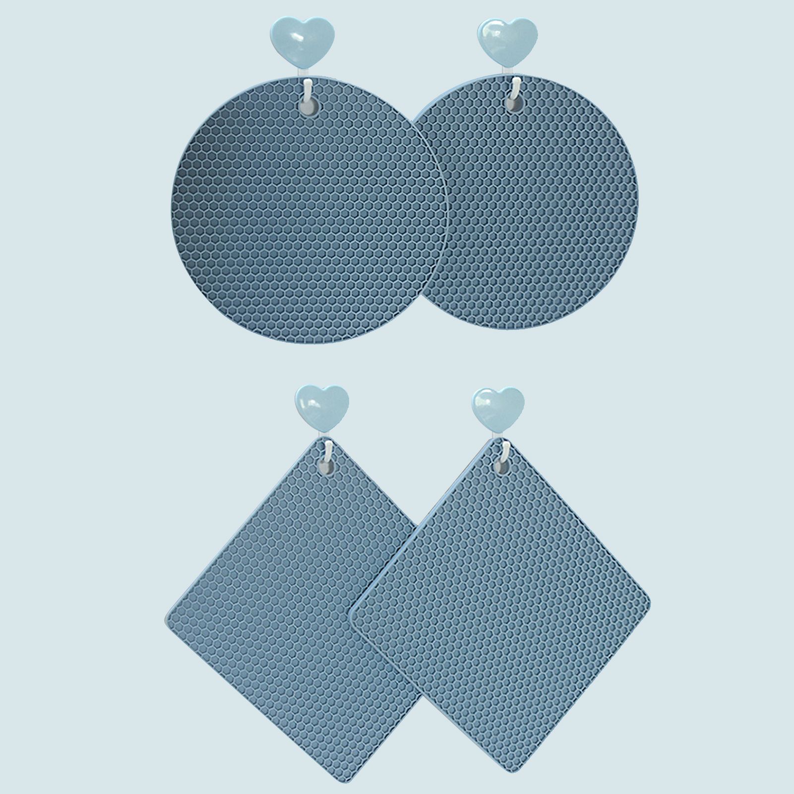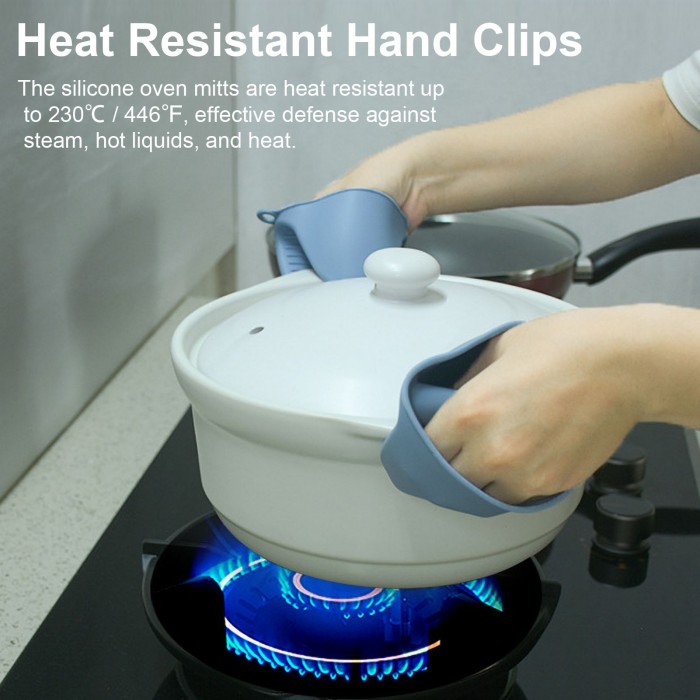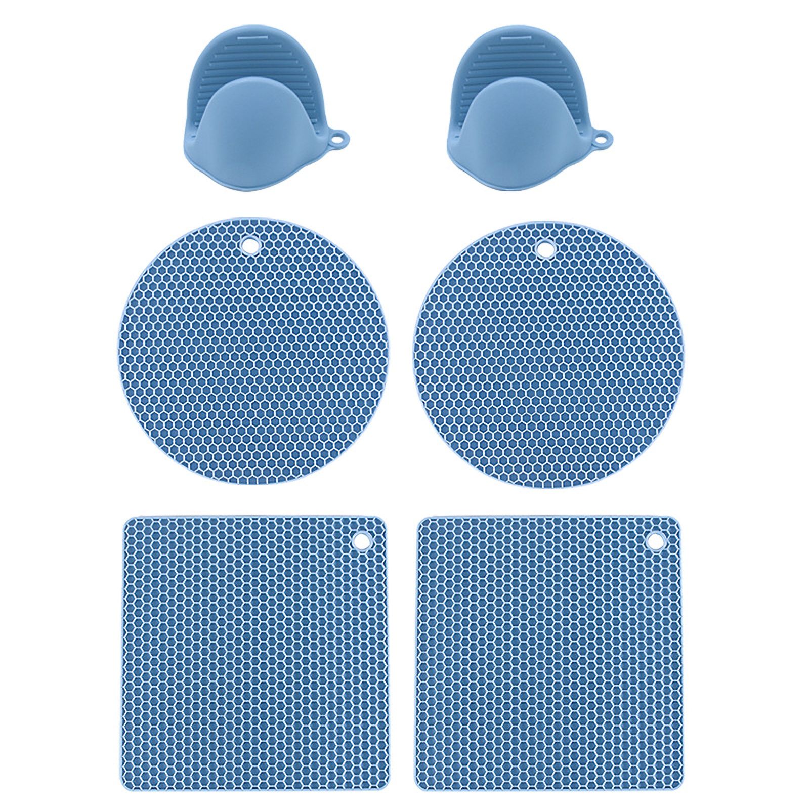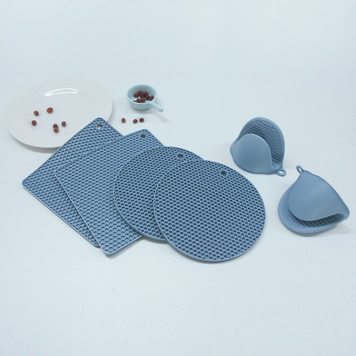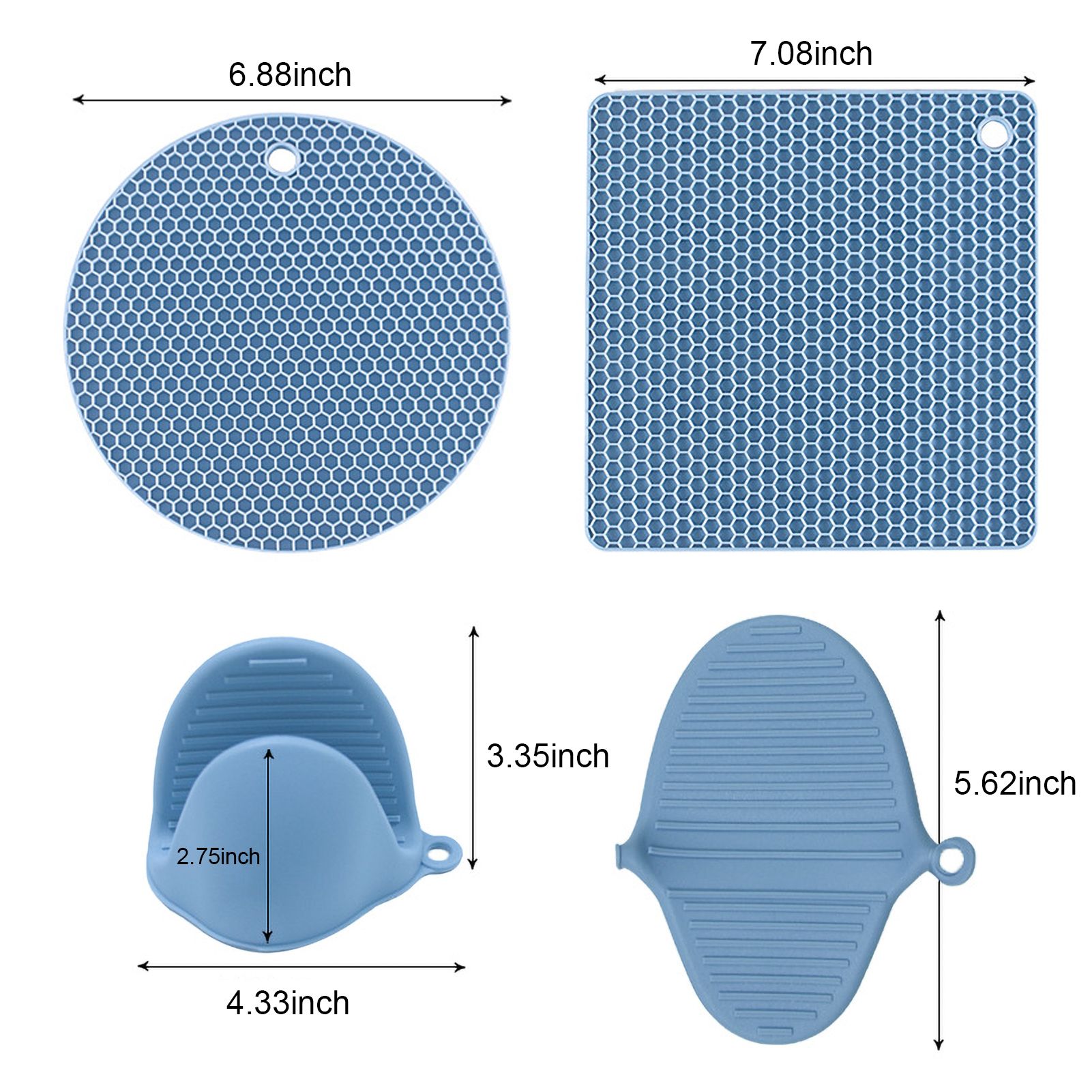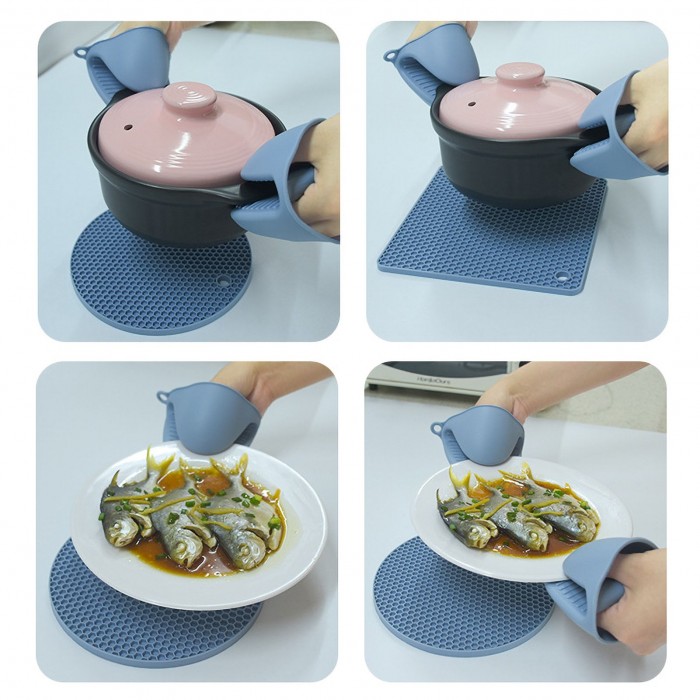 The package lists consist of 2 round table mat, 2 square table mat, and 2 oven hand clips. The silicone oven mitts are heat resistant up to 230℃ / 446℉, effective defense against steam, hot liquids, and heat. Make your cooking time easy and safe.