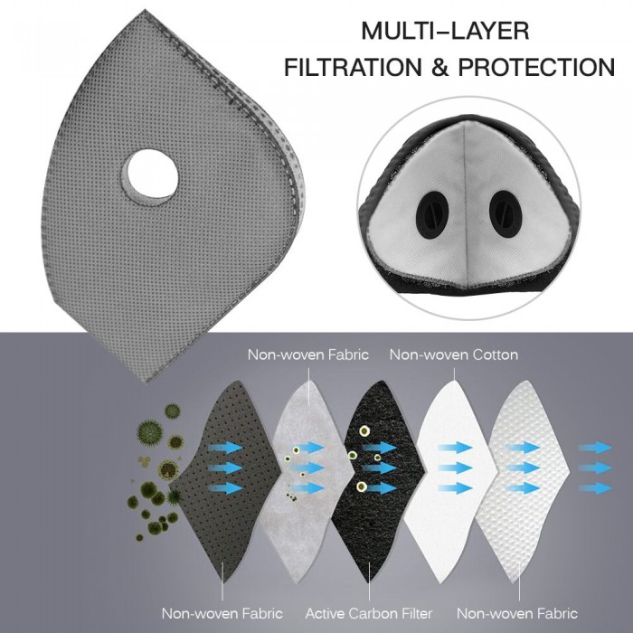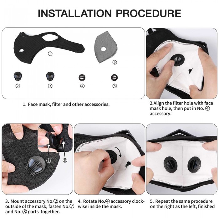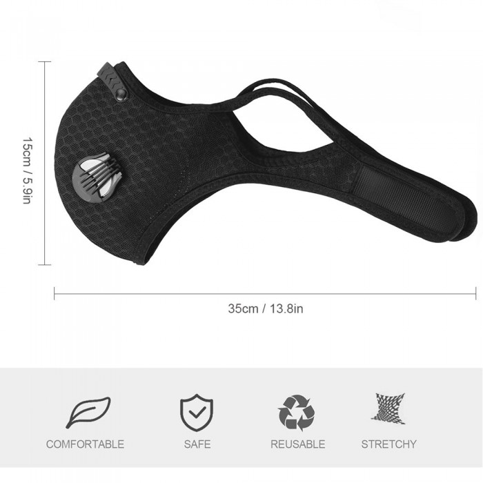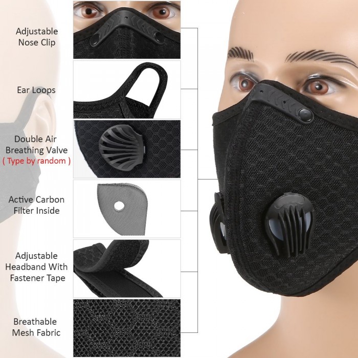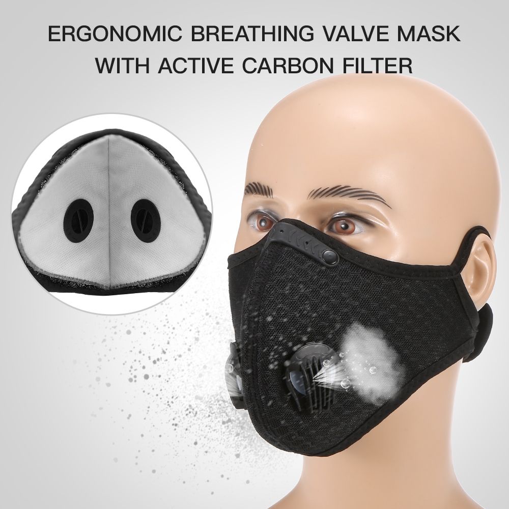 The Double Breathing Valve Mask with Active Carbon Filter features on its unique ventilation.Mesh fabric and double air breathing valves for small air resistance and smoother breathing.Suitable for running, cycling, camping, traveling, climbing, outdoor activities and daily use.
