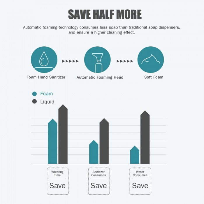 Touchless Rapide Foam Dispensering --- Adopt high sensitive infrared sensor, response time only 0.25S.  Automatic foaming technology consumes less soap than traditional soap dispensers,  and ensure a higher cleanning effect.