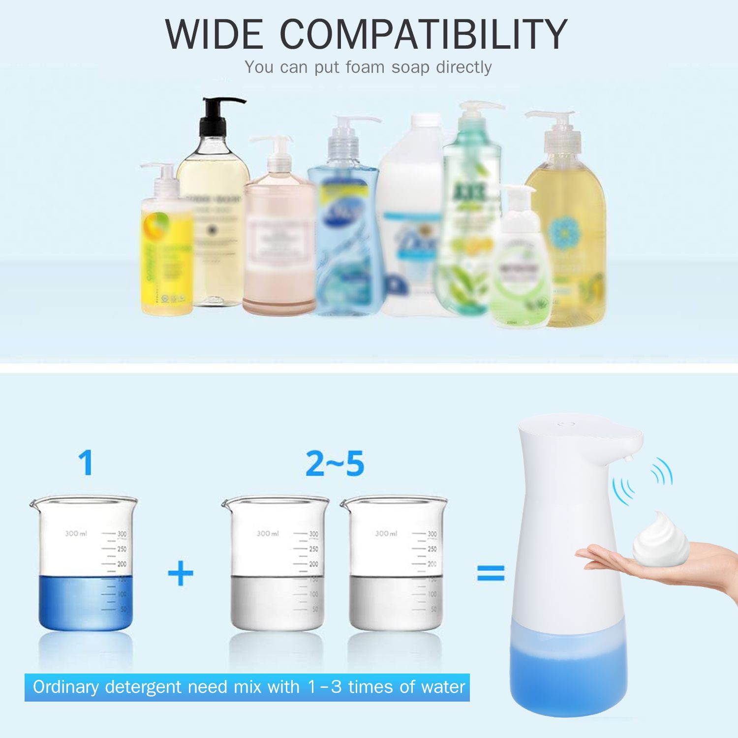Multiple Compatibility --- The soap dispenser is compatible with mostly all liquid soap,such as shower gel,detergent,shampoo and facial cleanser,which can be mixed with 1 to 3 times water. Suitable for family, hotel, hospital, bath room and other places
