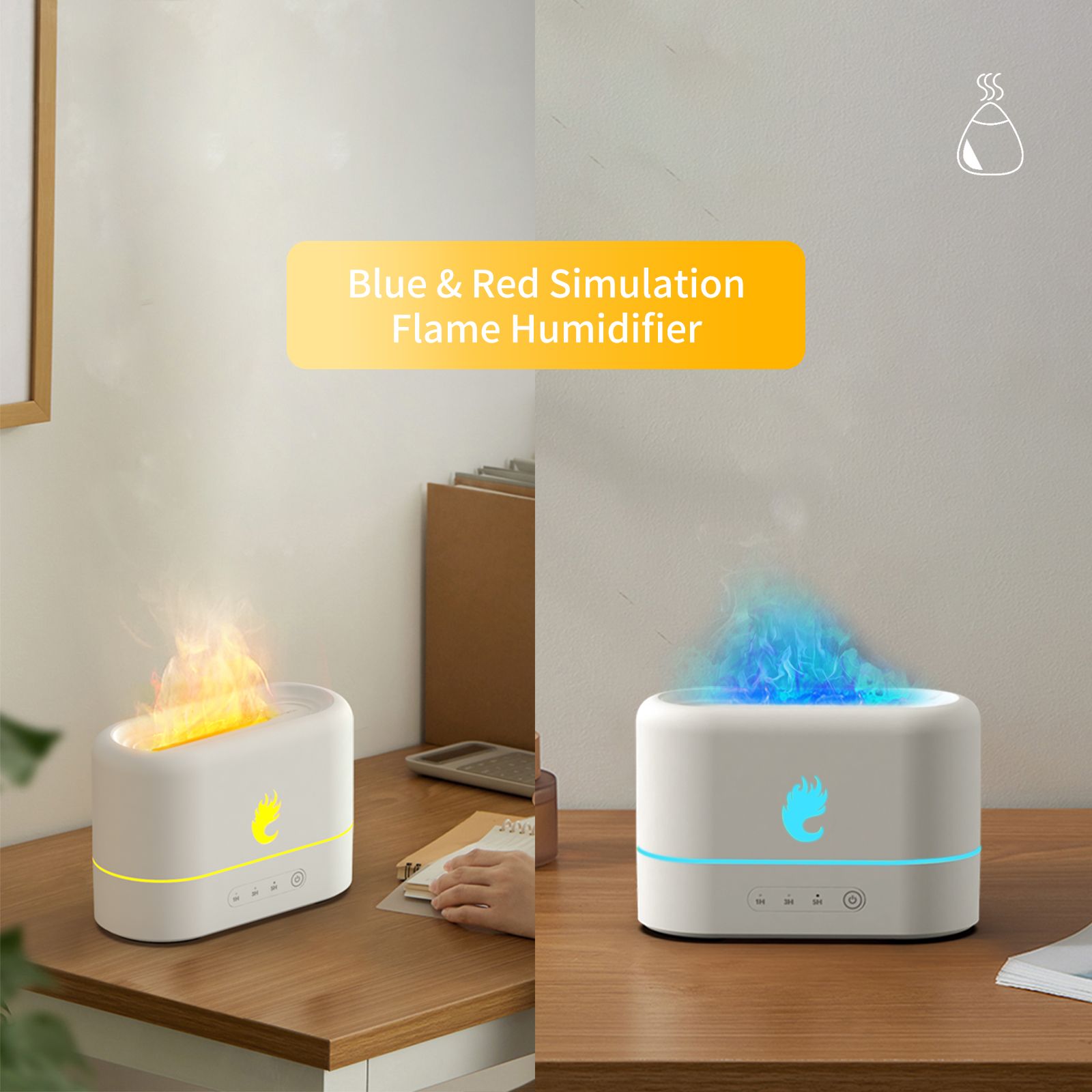 [Two-color Flame]The latest blue flame and classic red flame for choices, and there are 2 kinds of lights with adjustable brightness. The humidifier will bring you romantic company at night.