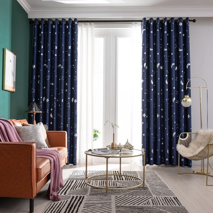 5. This carefully crafted, double-sided curtain has a moon and stars pattern on the front and a plain color palette on the back, with a light-blocking fabric lining.