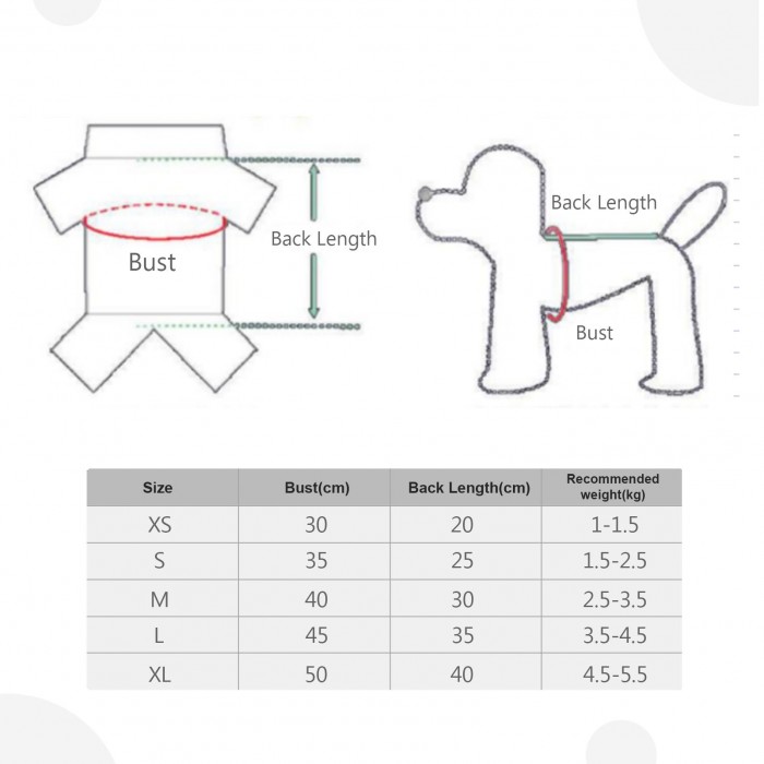 S: Bust: 35cm; Back Length: 25cm, (suitable for 1.5-2.5kg);