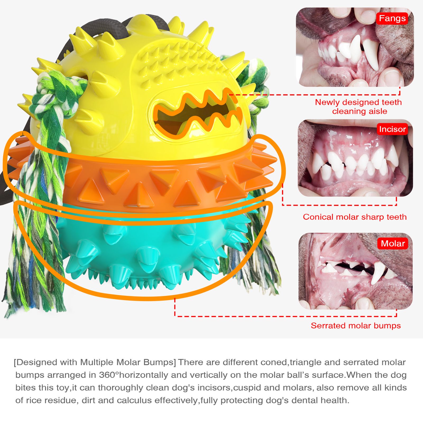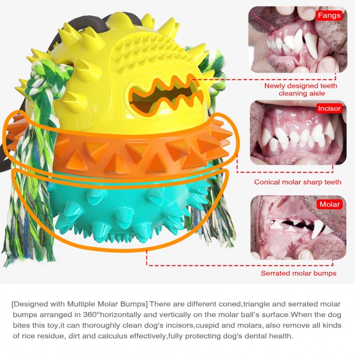 Tug toy for dogs is designed with a molar ball, it has different size of molar granulars around 360 ° surface of the ball, when your puppy chewing the ball, it can effectively remove the dirty and calculus on teeth, you can put snacks in the dog chew toy as dog food, to attract dogs to play this toys