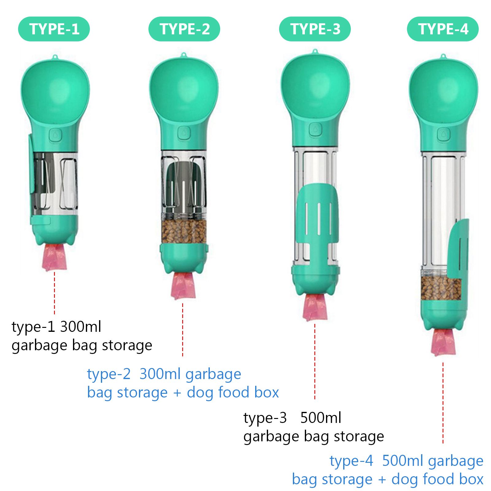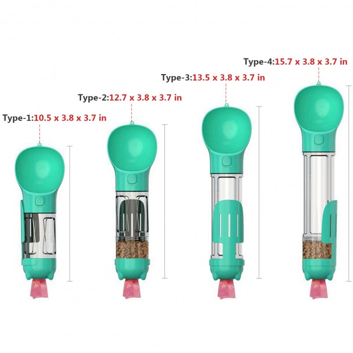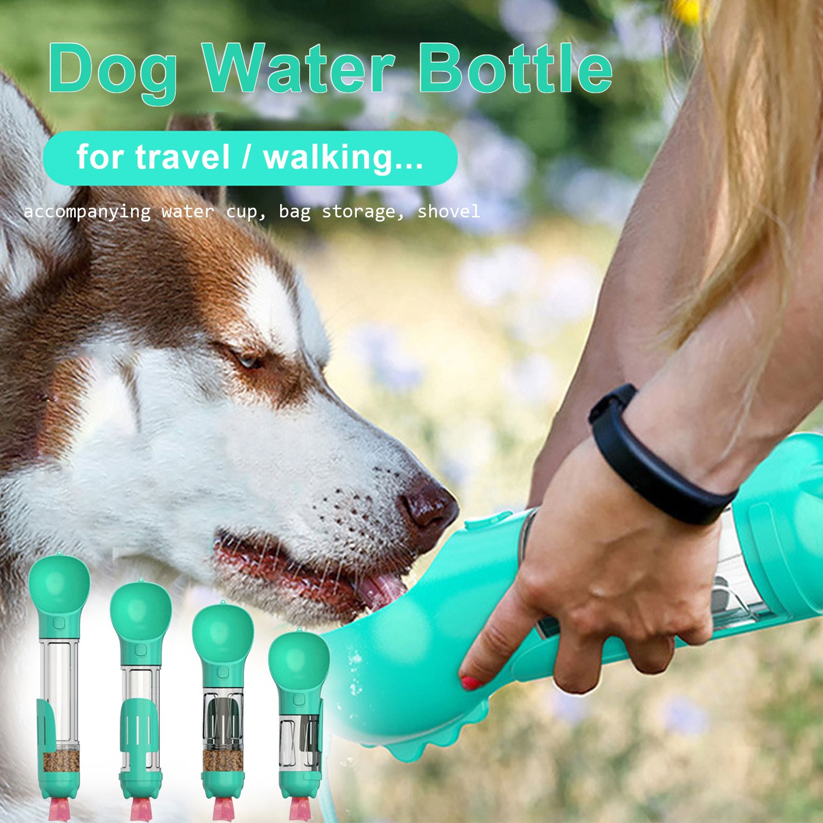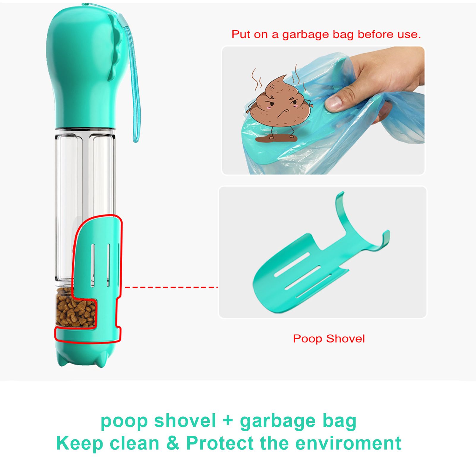 Multiple functions: This pet water bottle is a combined water bottle, dung shovel, and pet dung garbage bag into one. Each component can be disassembled and used independently. There is also an optional food storage box function. Small size, easy to carry and clean.