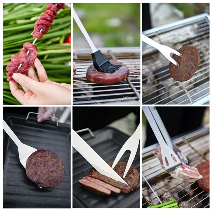 The BBQ tools designed with an ergonomic handle and hanging hook, convenient and easy to storage around your grill or kitchen.