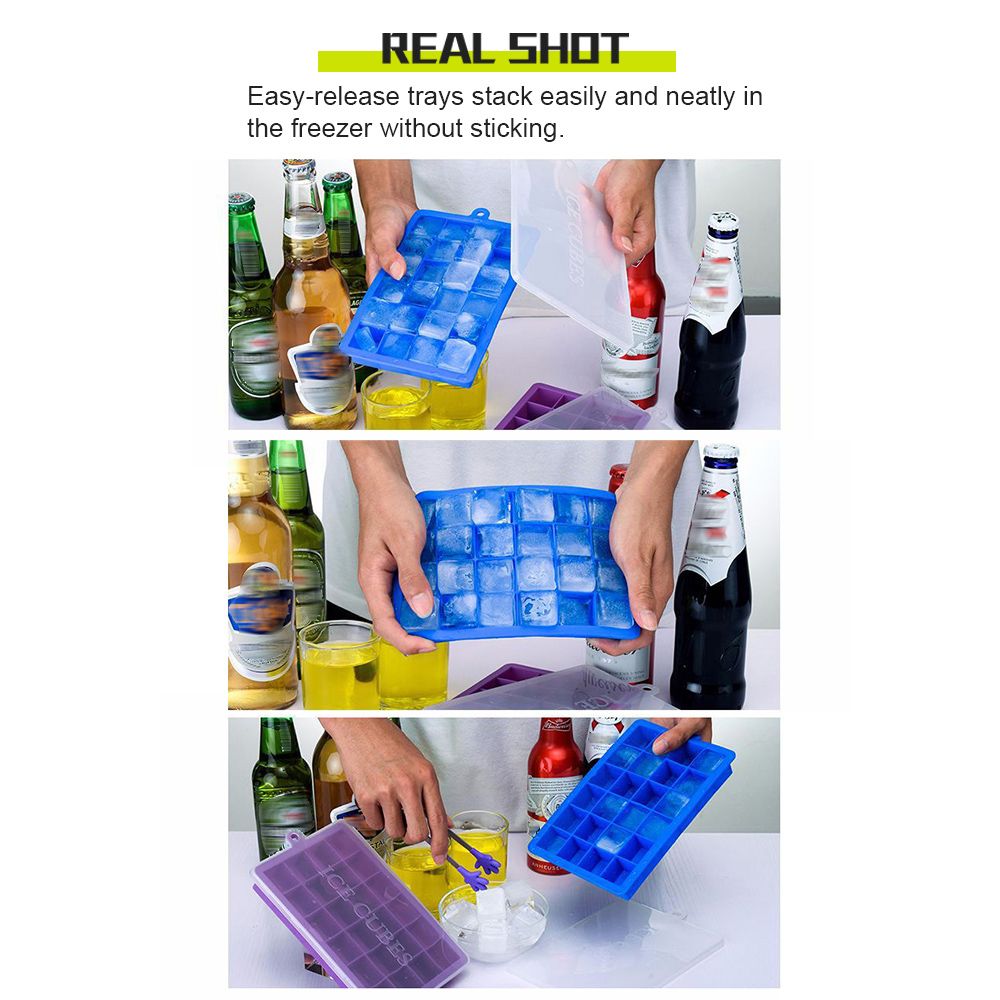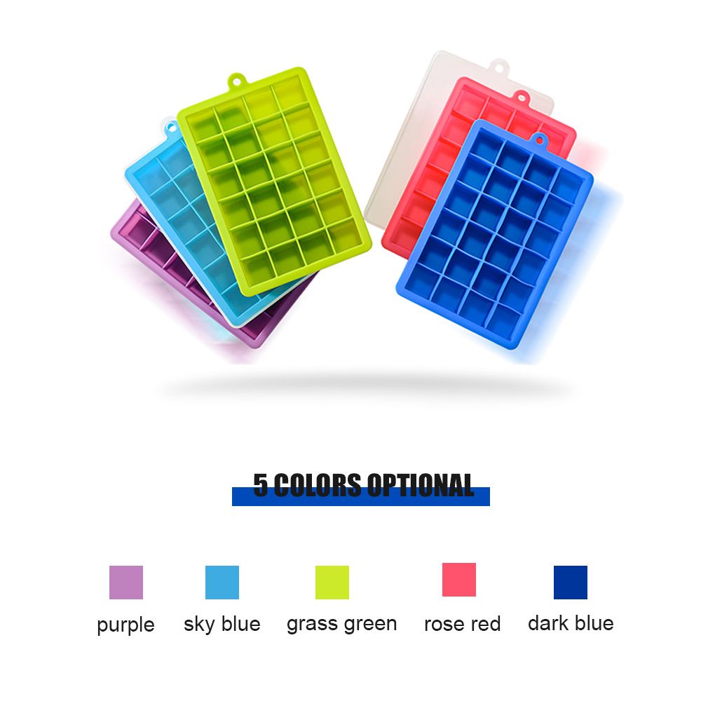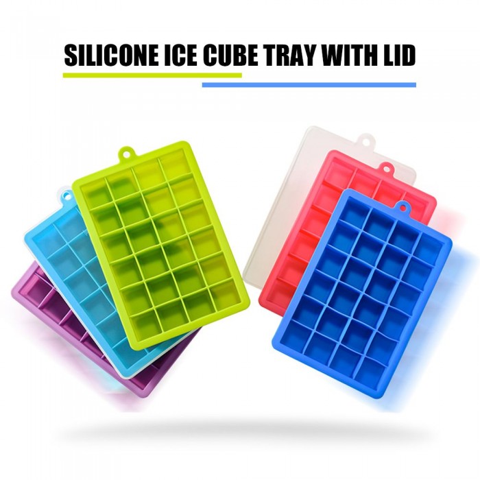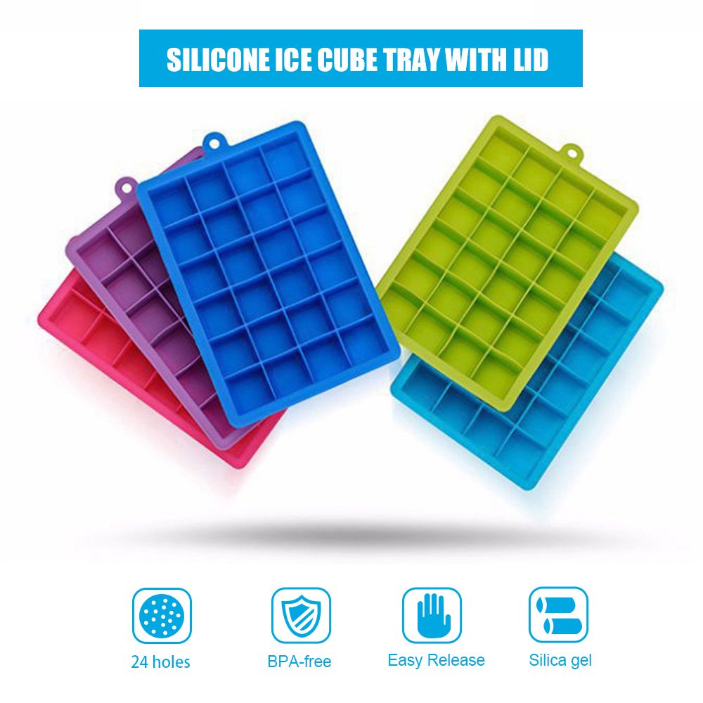 This product is a 24 holes ice cube tray with lid that can be used to make ice cubes, jelly cubes, bread cubes, chocolate cubes, milk cubes, and so on. Silica gel material makes it safe to contact foods directly. With a lid, it can provide delicious food without the odor of the refrigerator.