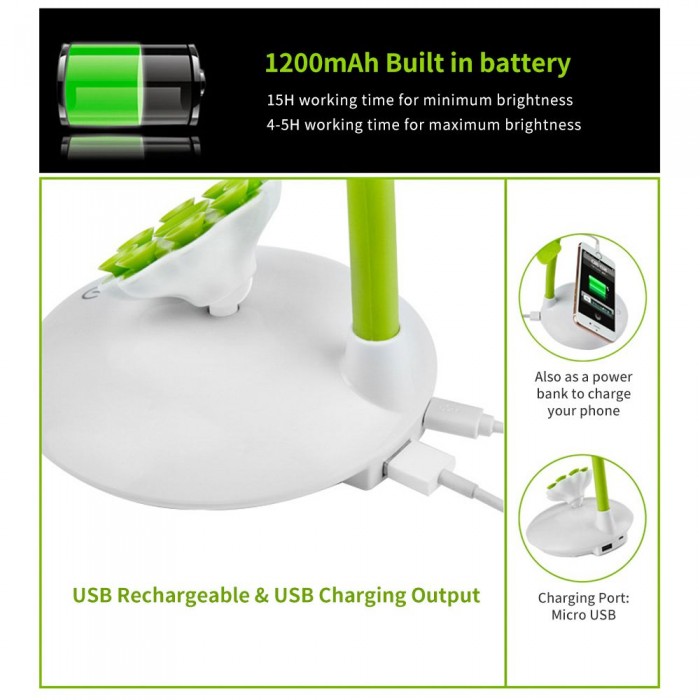 1200mAh rechargeable batterys operated lamp, last for 15 hours on maximum brightness.