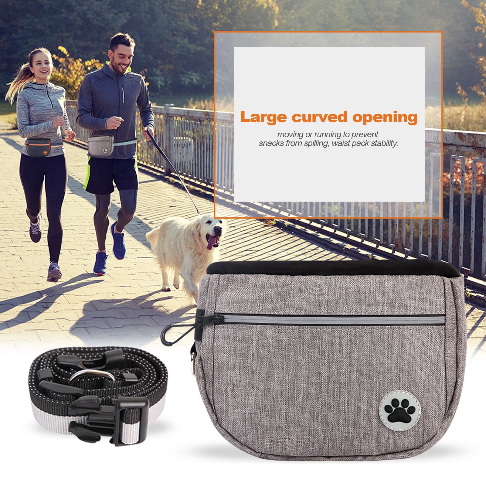 Large curved opening: moving or running to prevent snacks from spilling, waist pack stability.