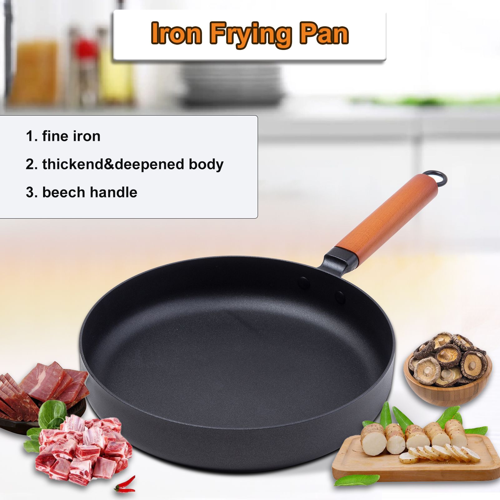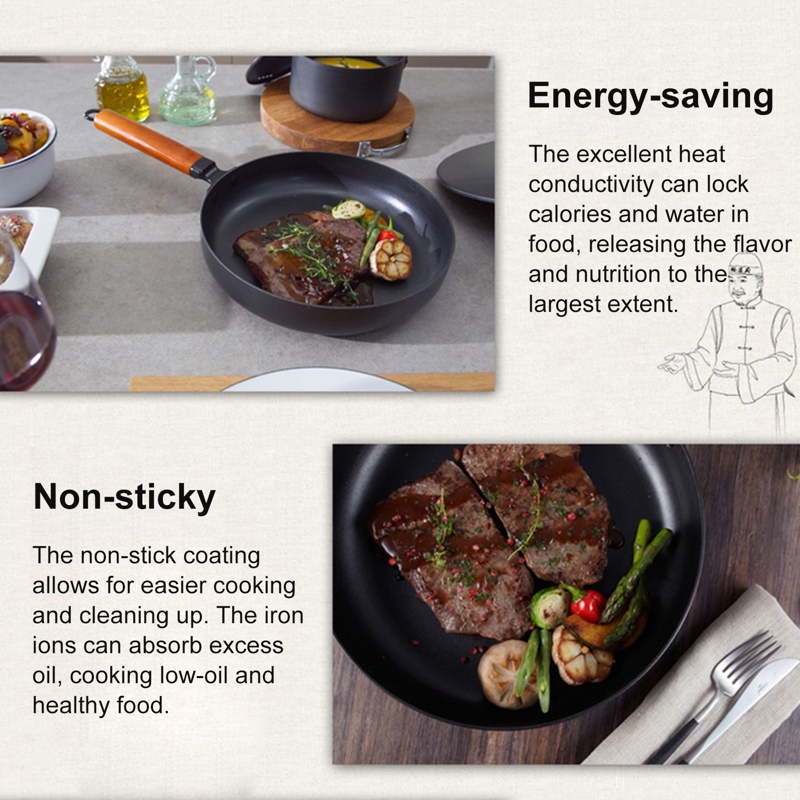 Non-stick: The non-stick coating allows for easier cooking and cleaning up. The iron ions can absorb excess oil, cooking low-oil and healthy food.