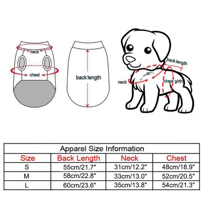 L: apparel back length: 60cm/apparel neck circumference: 35cm/apparel chest circumference: 54cm