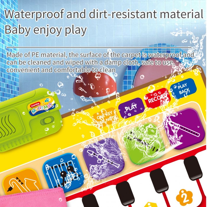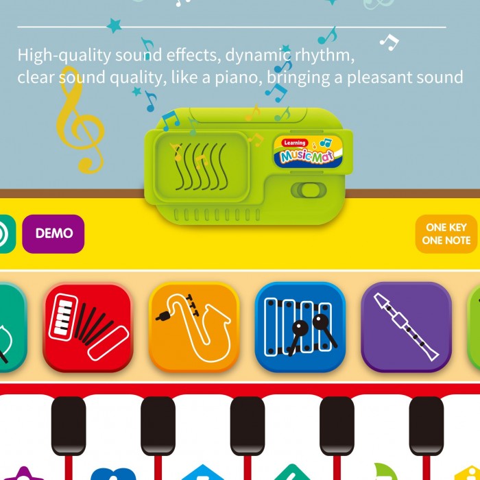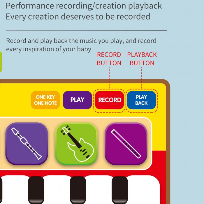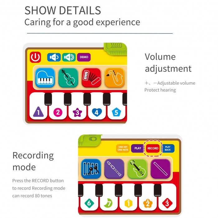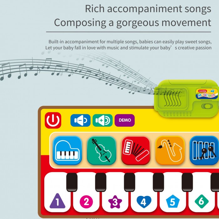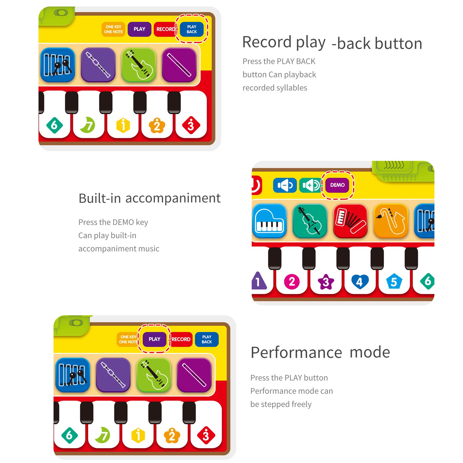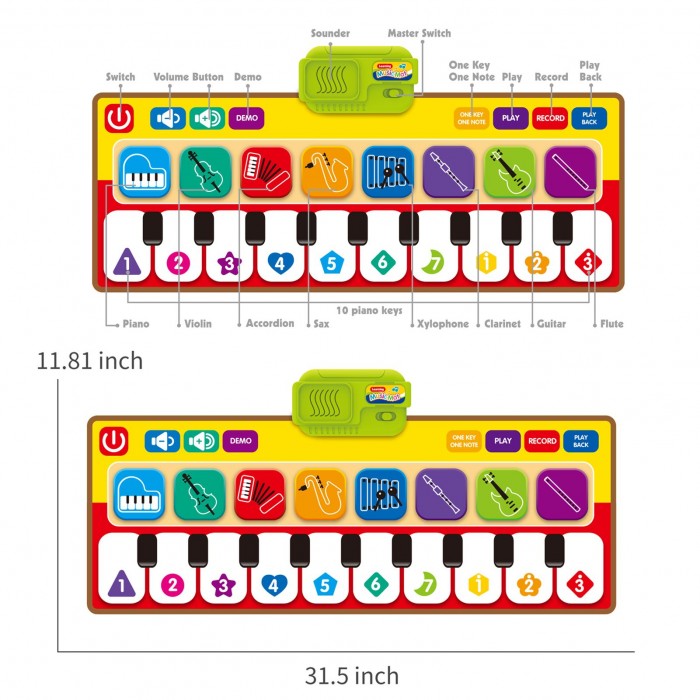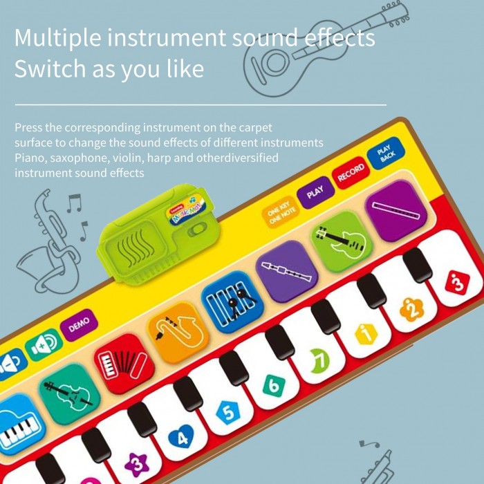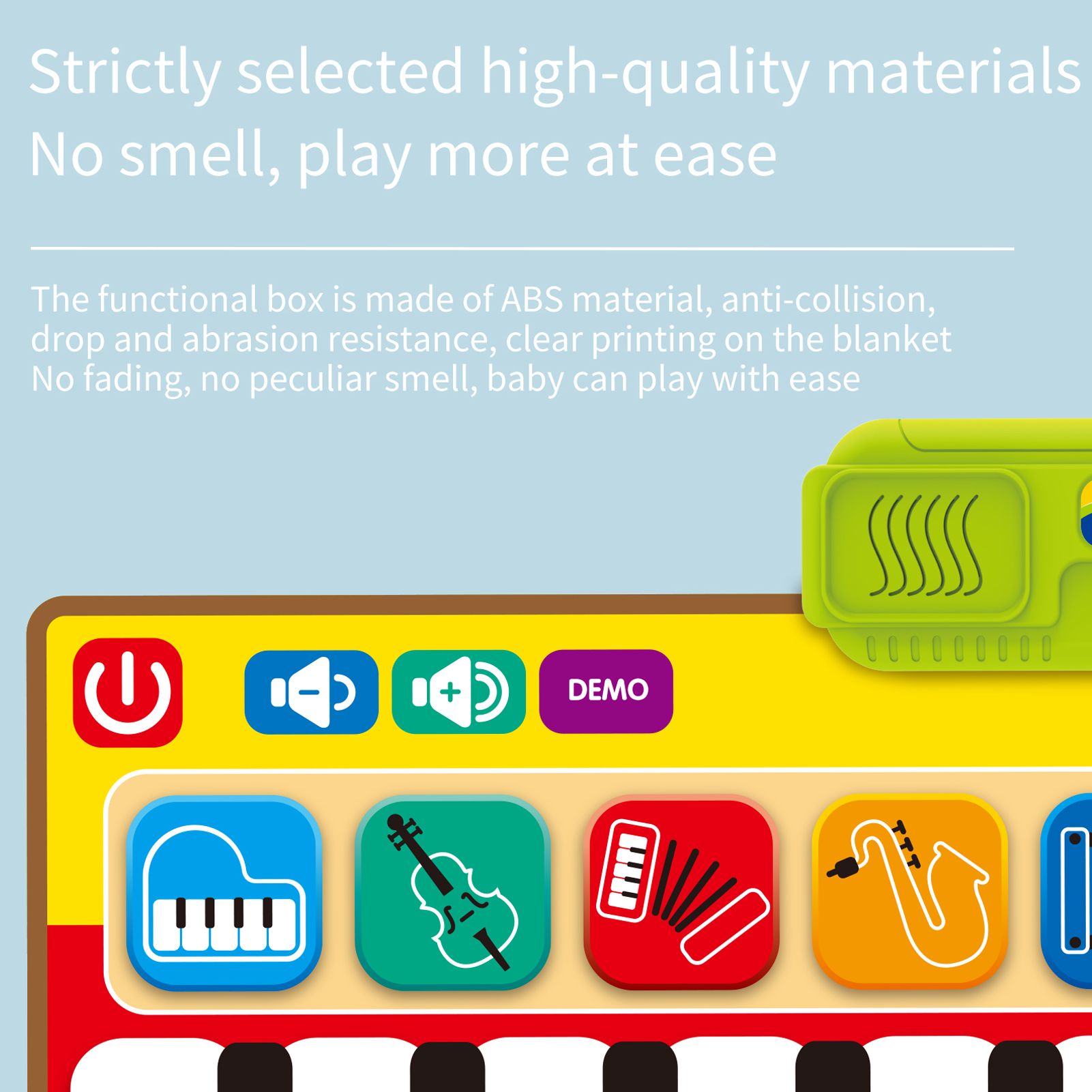 【MULTIFUNCTIONAL】Kids piano mat with 10 musical keys and 8 instruments, the sweet music is good for the children's hearing. You can adjust the volume of the music blanket to choose the suitable volume for your kid. Record and playback the music you play, and record every inspiration of your baby. Built-in accompaniment, press the DEMO key Can play built-in accompaniment music.