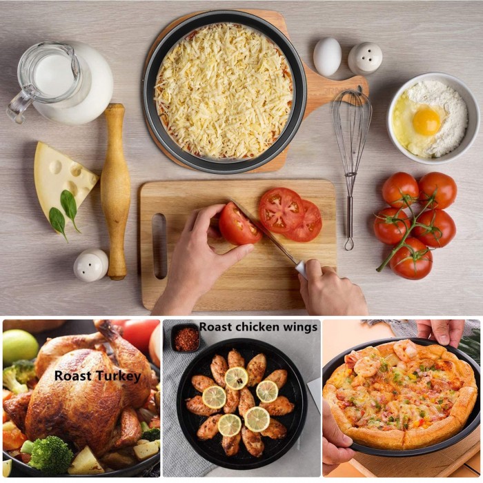 Non-Stick Round Pizza Tray -- This round tray adopts anti-stick coating treatment process, non-stick for easy release and quick cleanup when using it, safe and non-toxic, good for demoulding.