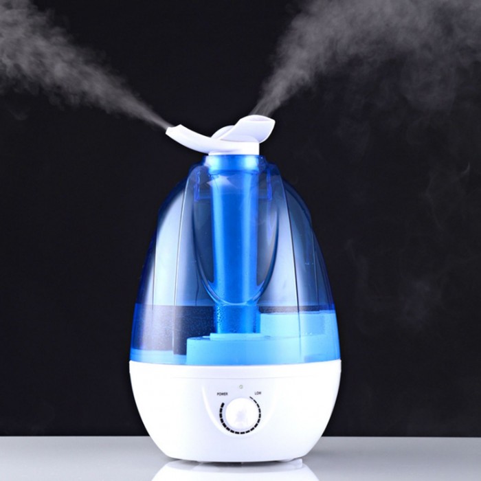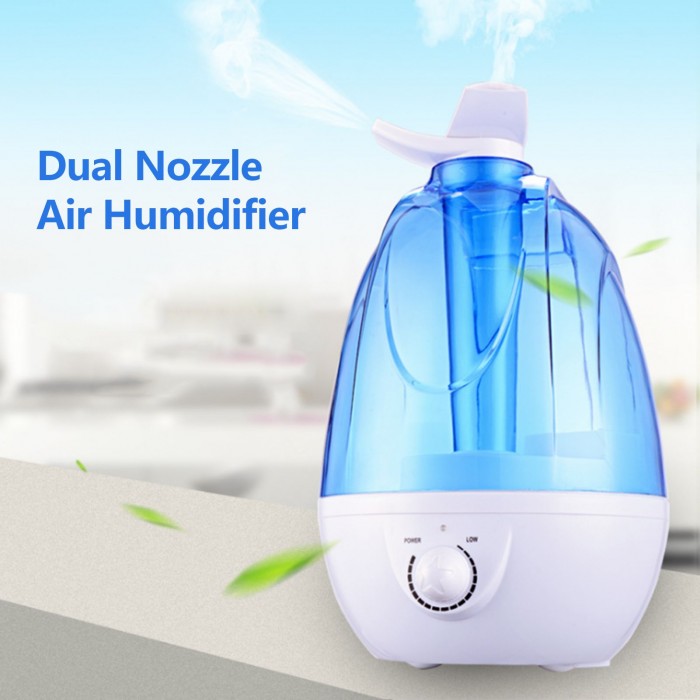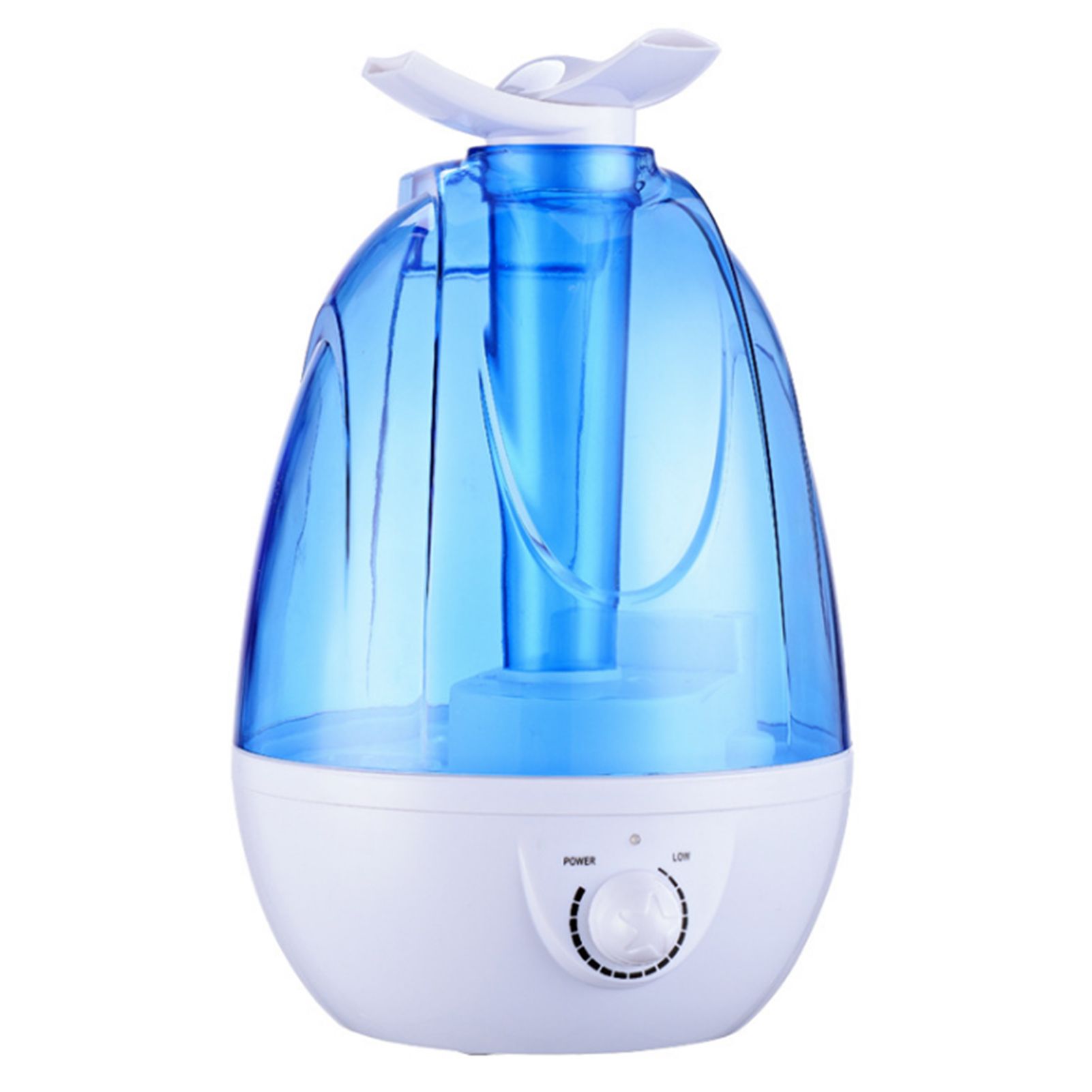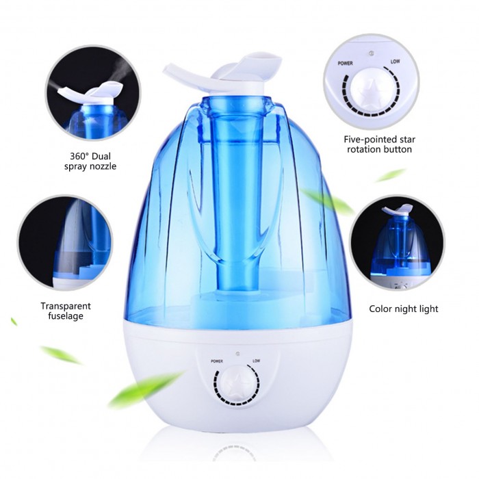 Domestic use multifunctional air humidifier, 4L large capacity, transparents blue bottle, convenient to observe the change of water quantity. Ultrasonic cool mist technology, fine spray, small molecules humidify the air. Rotatable dual nozzle, 360° multiple angle large area moisting, one-key switch control light, delicate and practical in daily life.