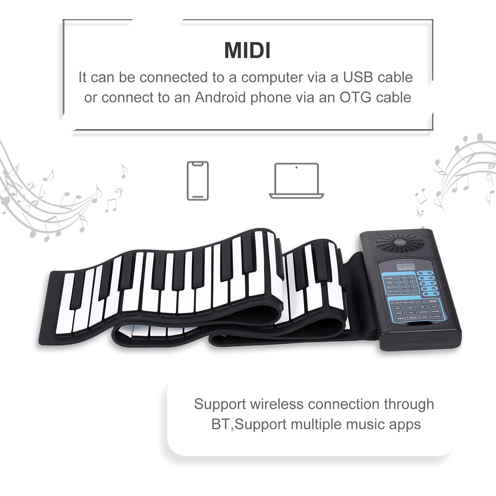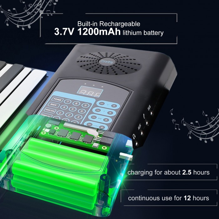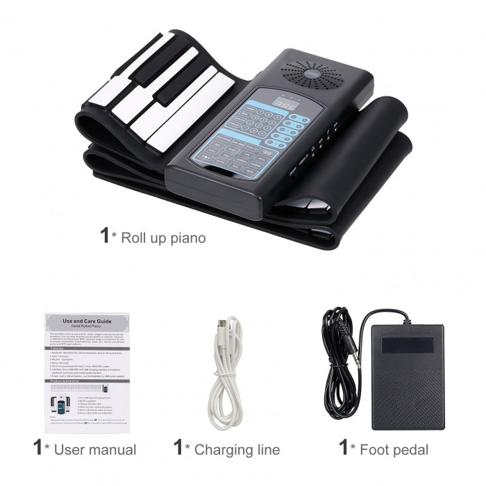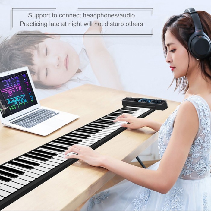 This roll-up piano is easy to carry, multifunctional, and built-in 1200mAh lithium battery for easy use. Is a good companion in your life.
