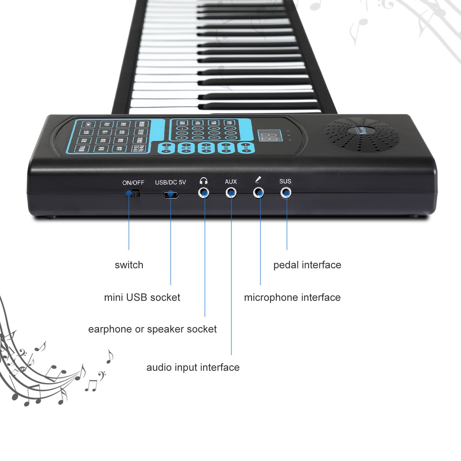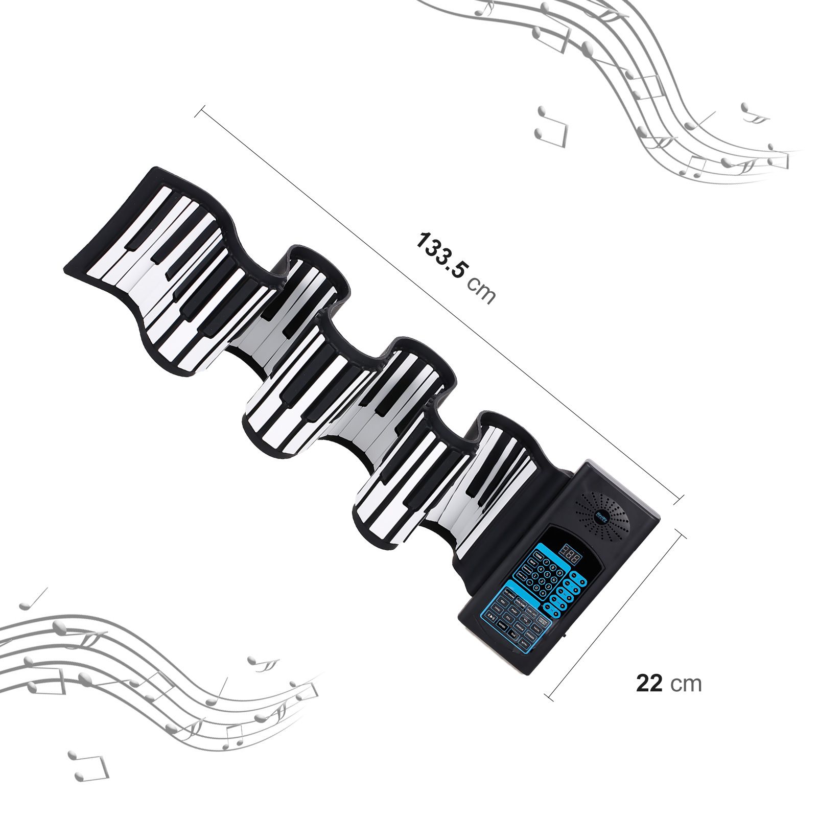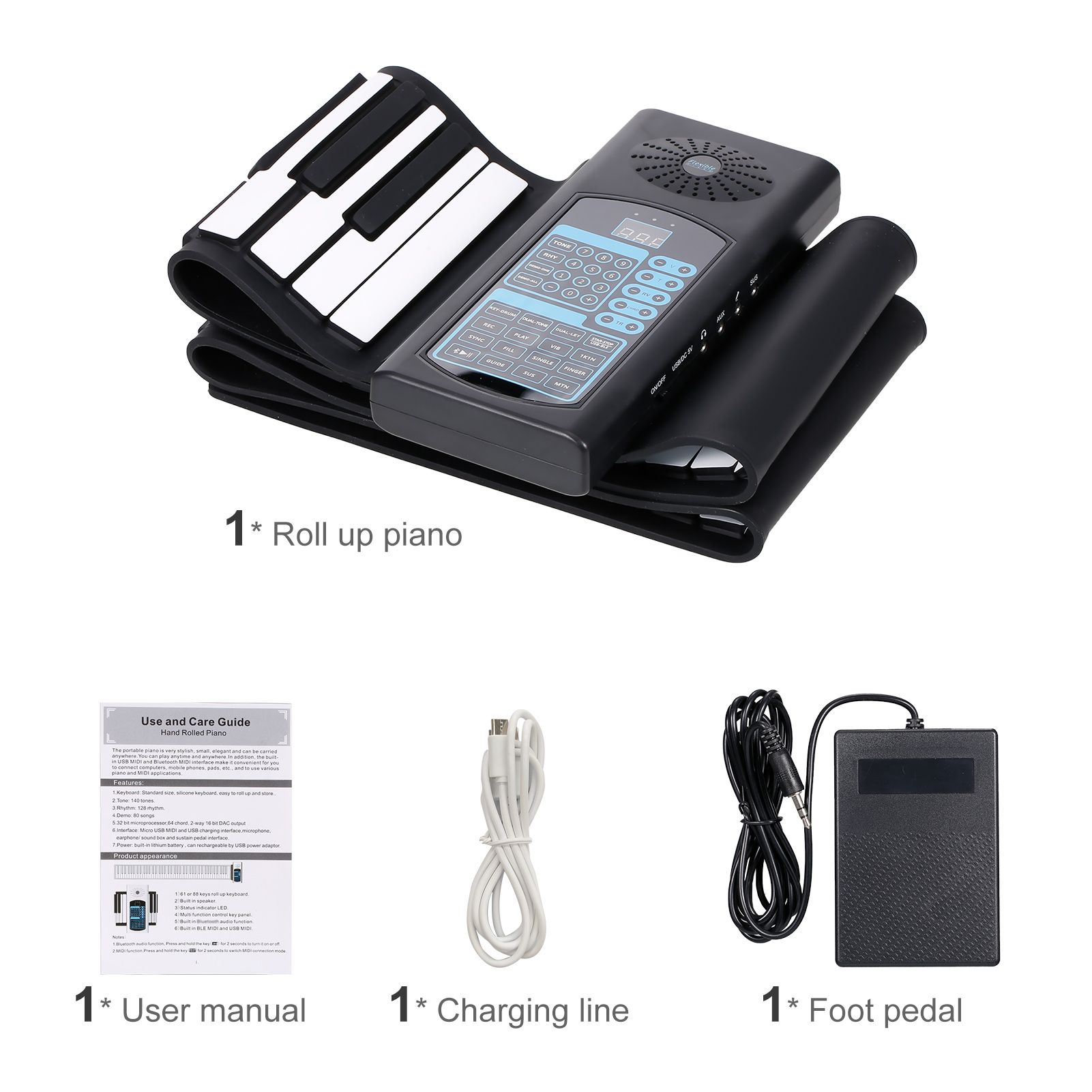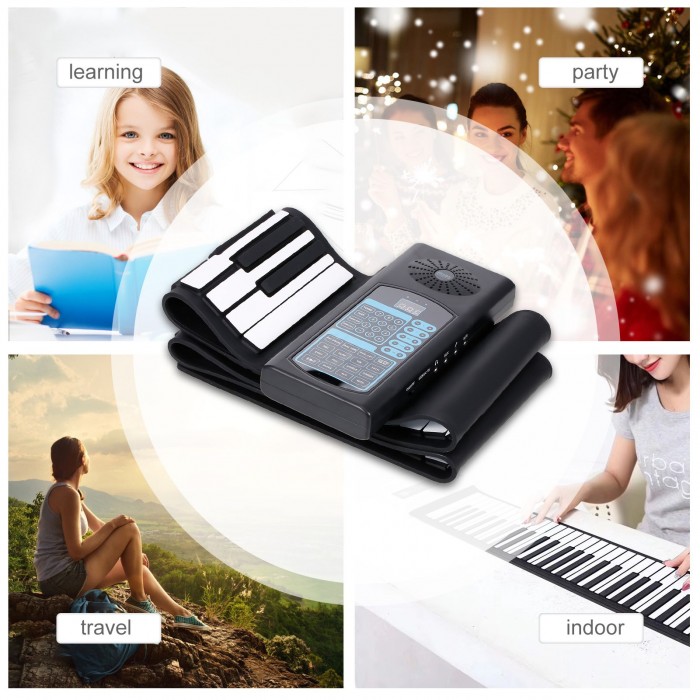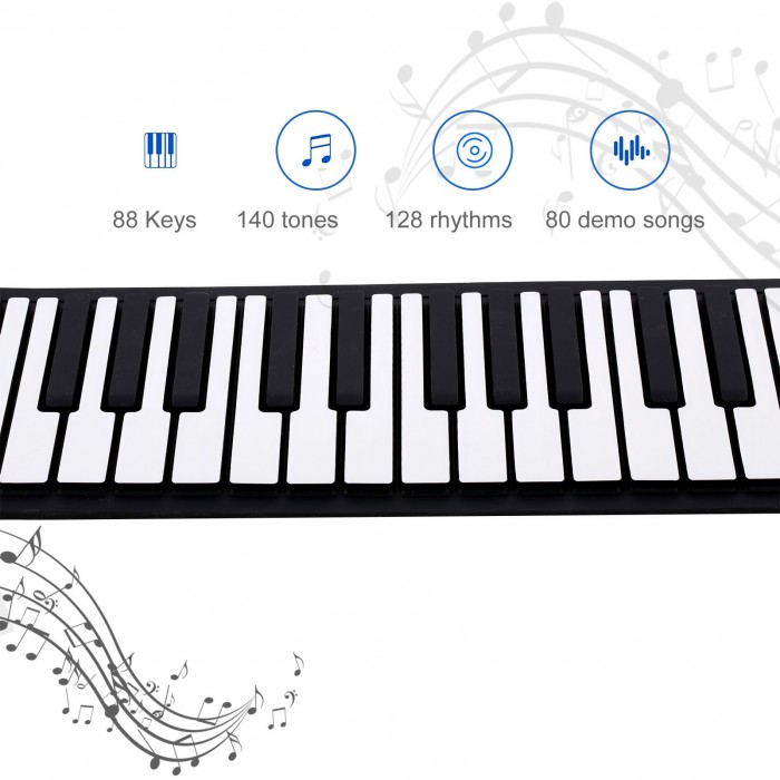 Roll Up Piano: Standard 88 keys, the piano can be rolled up, easy to carry. 140 tones and 128 rhythms to choose from. There are 80 demo songs, with two kinds of demo song demonstration modes. 32-bit microprocessor, multifunctional, and the tone more mellow.