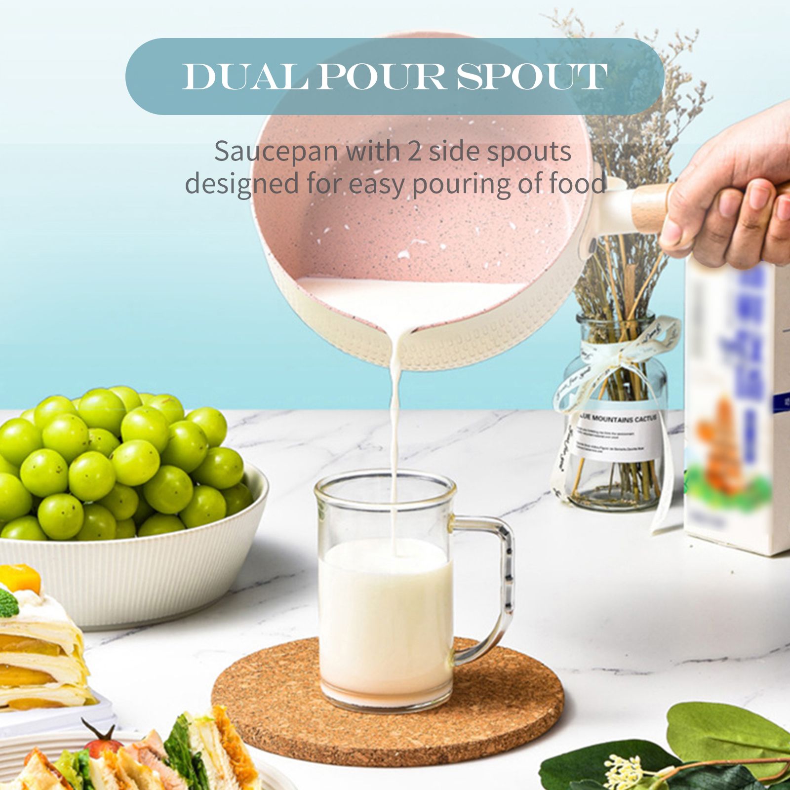 [Dual Pour Spout]saucepan with 2 side spouts designed for easy pouring of food.