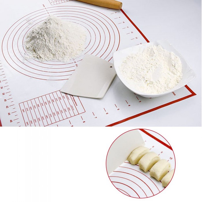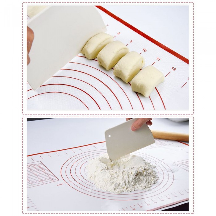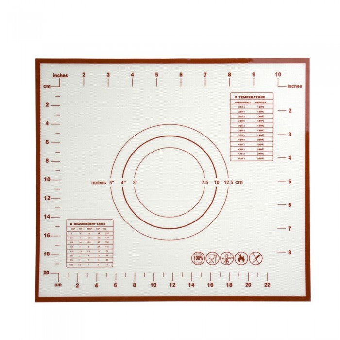 This baking board includes measurements and conversion tables. The markings on the mats make it easy to roll out the size that you need.