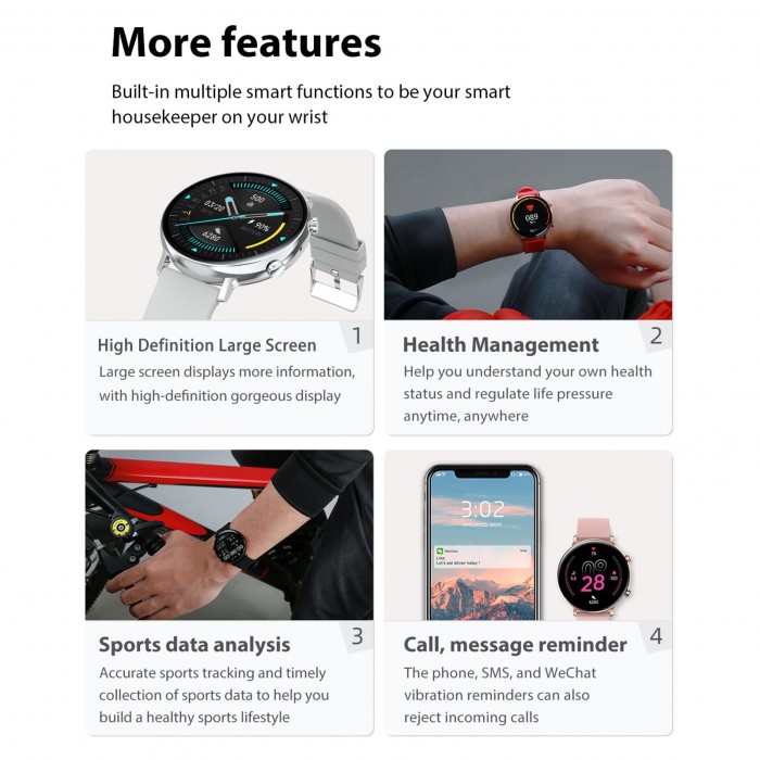 Supported alarm clock, stopwatch, do not disturb mode, wrist up bright screen, find m-obile p-hone, music control, photo control function.
