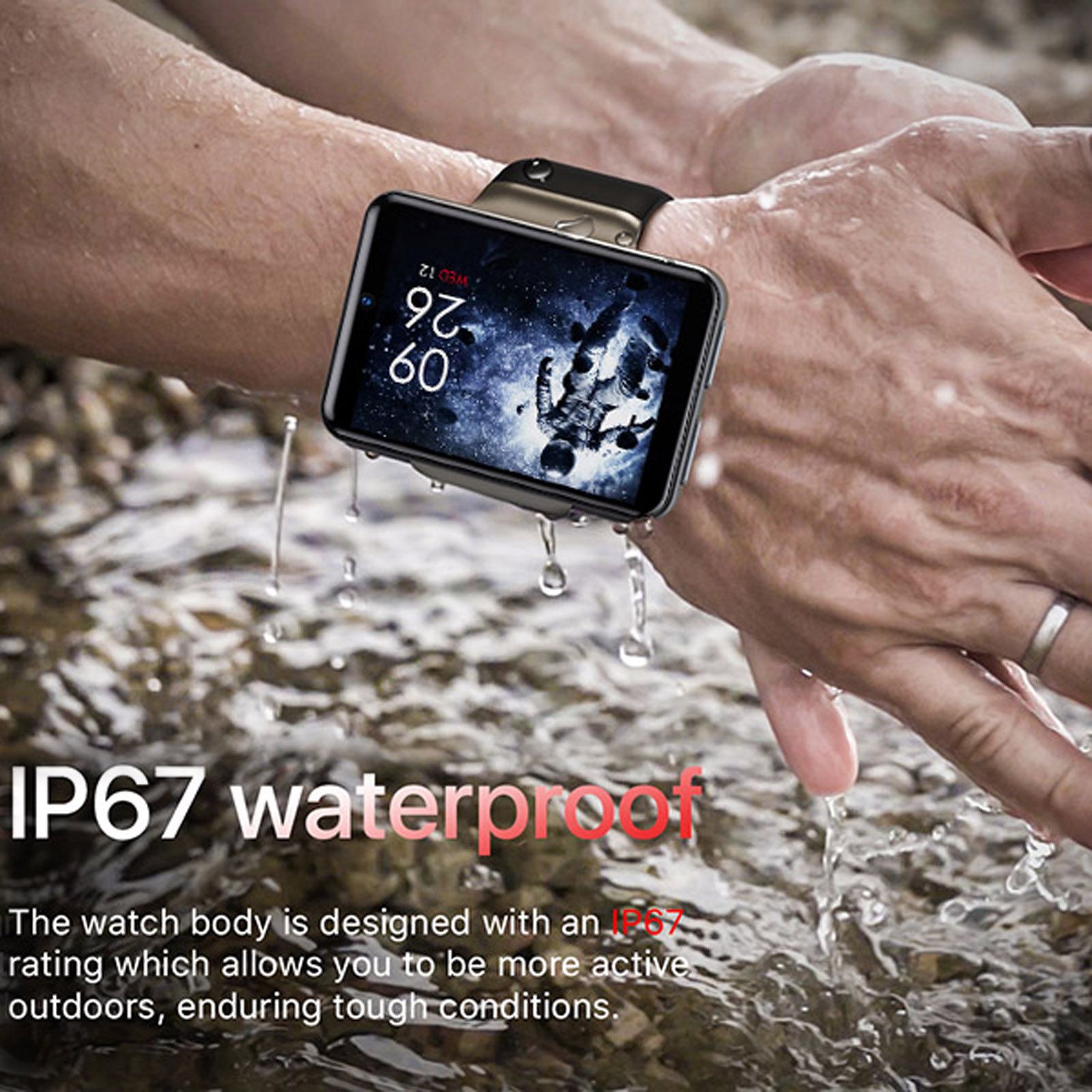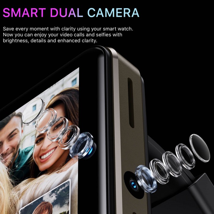 5MP front camera and 2MP side camera record every good moment. Supports face recognition unlock. This smartwatch is IP67 life waterproof and sweatproof.