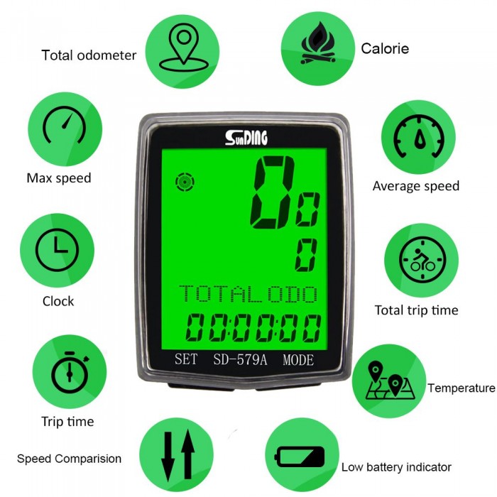 Display speed, average speed, max speed, time, distance, temperature and altitude, trip time, date, etc.