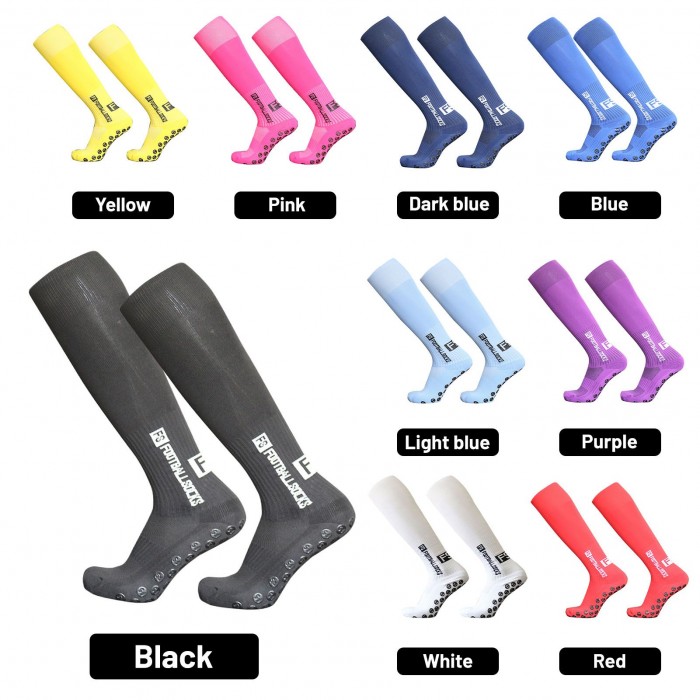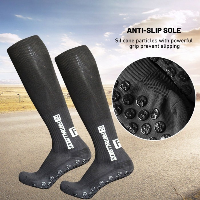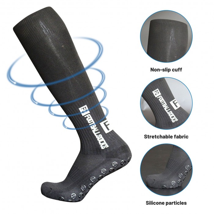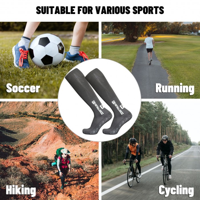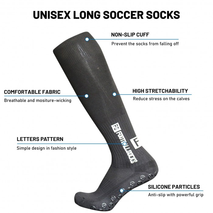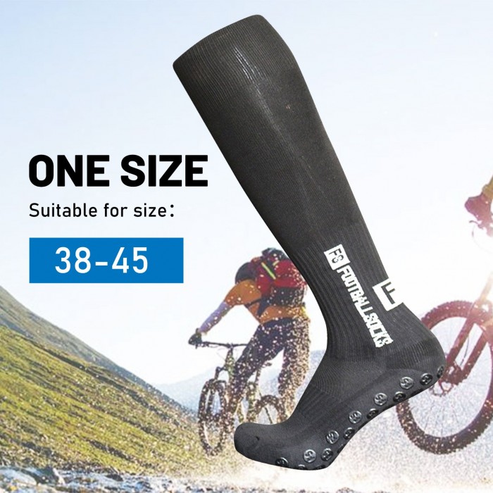 Compression football socks made from breathable and moisture-wicking fabric are very comfortable to wear for all kinds of sports. The silicone particles on the sole provide powerful grip to prevent slipping. The long scoccer socks can visually make your legs look longer.