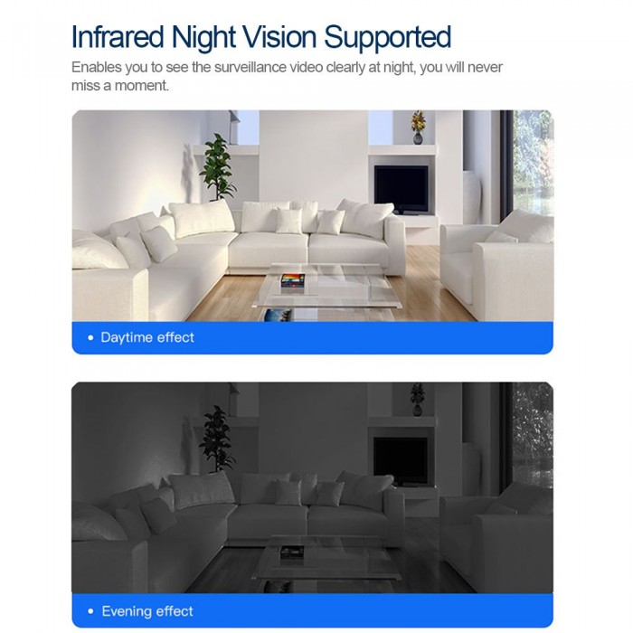 Night Vision: With 6 hid-den infrared LEDs without lighting, 10m night vision distance, remotely turn it on or off, no longer worry about recording at night. It also can be used for shops, meeting room, pets, nanny.