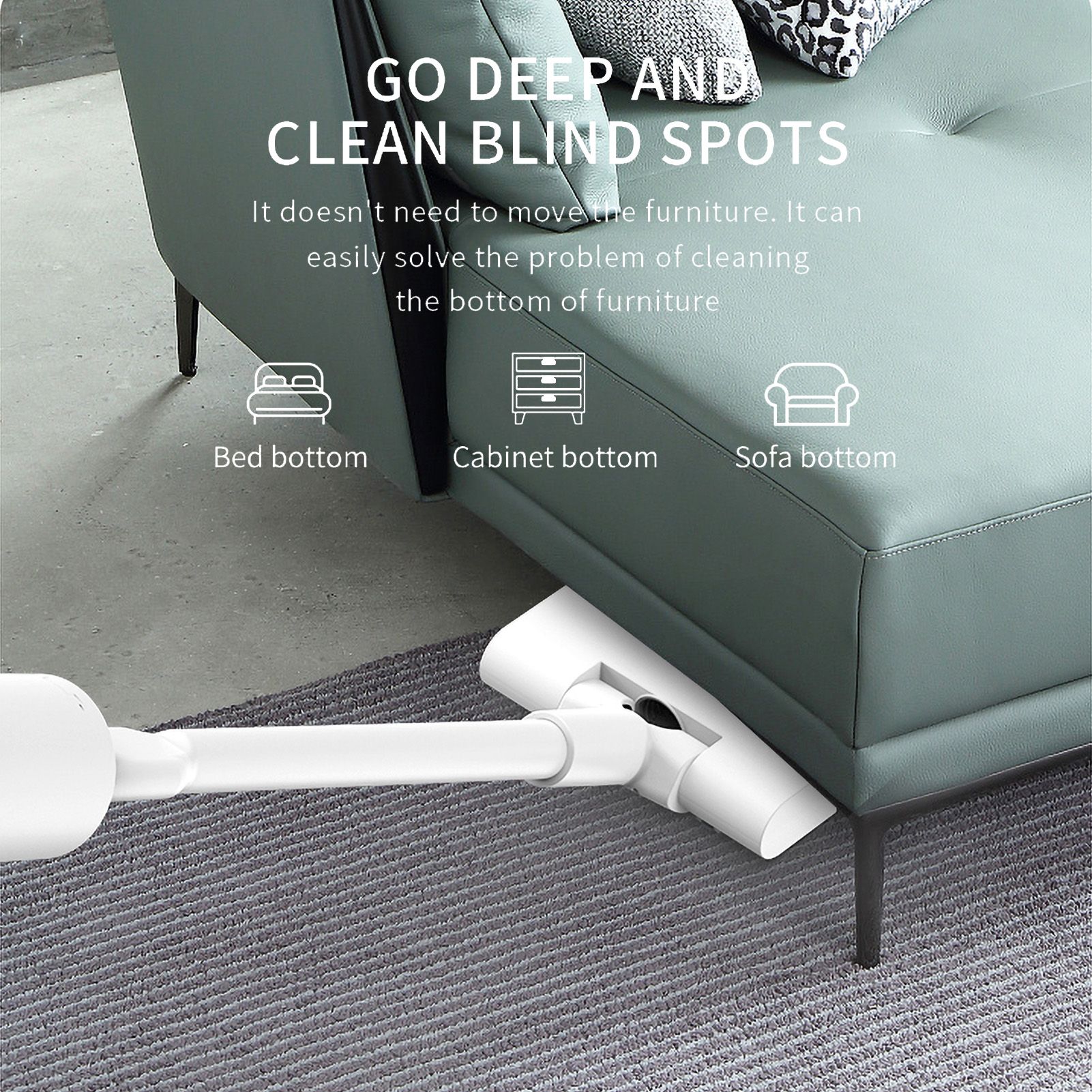 [Solve Cleaning Problems]The brush head of the vacuum cleaner can be rotated straight down by 180° without moving to the furniture. The vacuum cleaner can go deep into the blind area for cleaning and solve the problem of cleaning the bottom of the furniture.