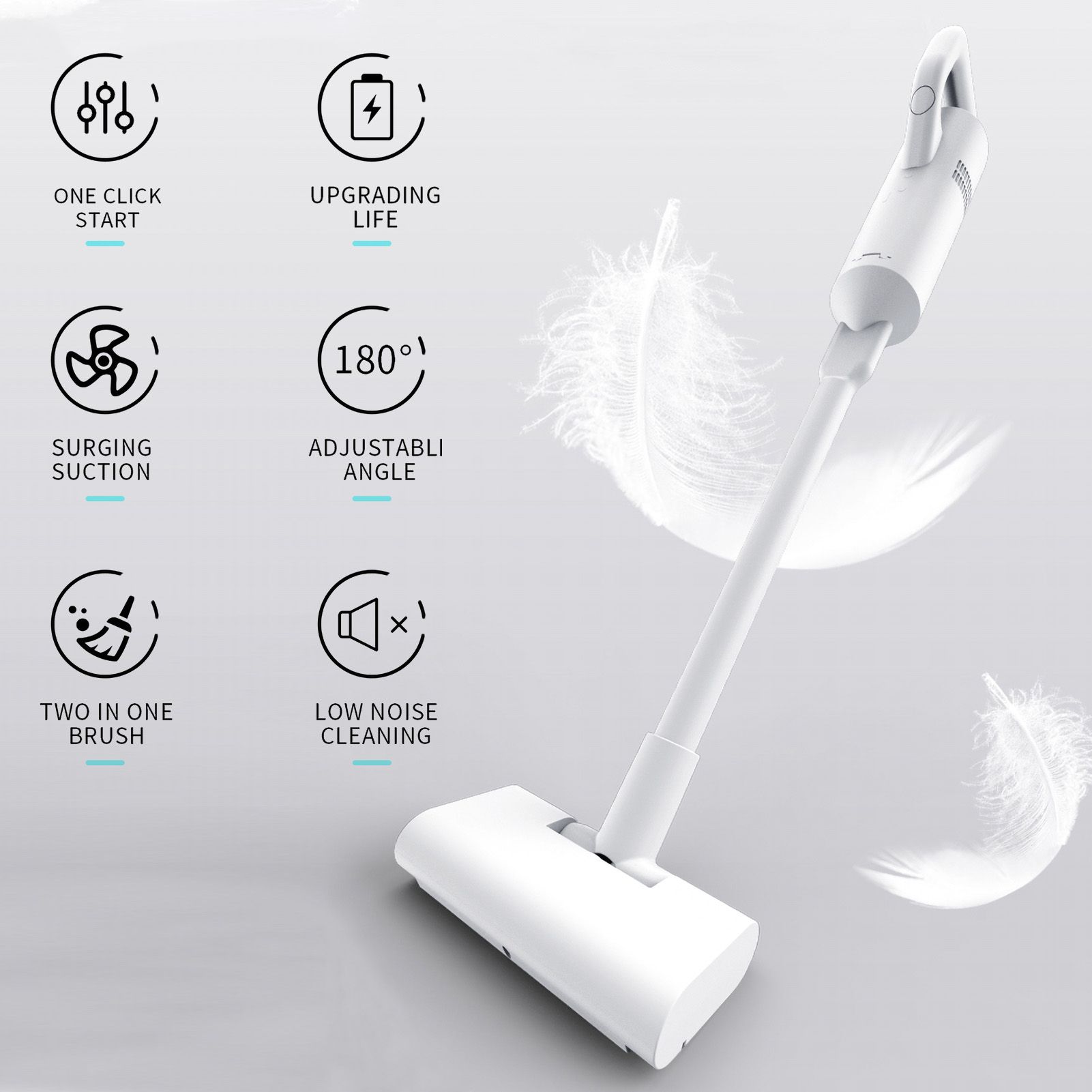 The vacuum cleaner is light in weight and reduces the burden of use. One-button start, easy to operate. It has high suction power and can last for 35 minutes. The vacuum head can rotate 180° and can replace different types of cleaning heads to solve cleaning problems. The cordless vacuum cleaner can be cleaned in a wide range without restriction; there is no need to worry about tripping over the cord. Direct suction air duct design does not block. The vacuum cleaner has low noise and no noise pollution.
