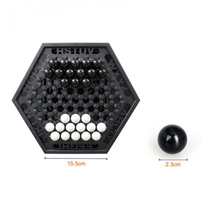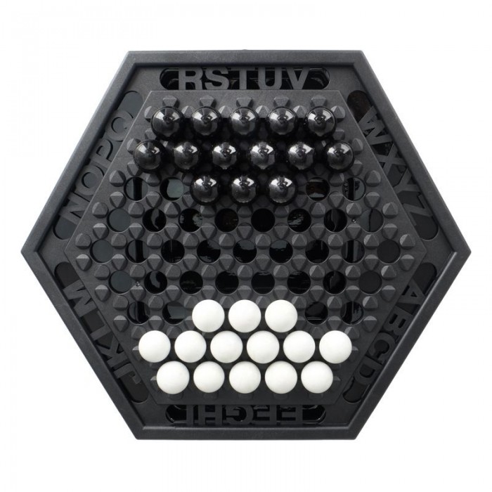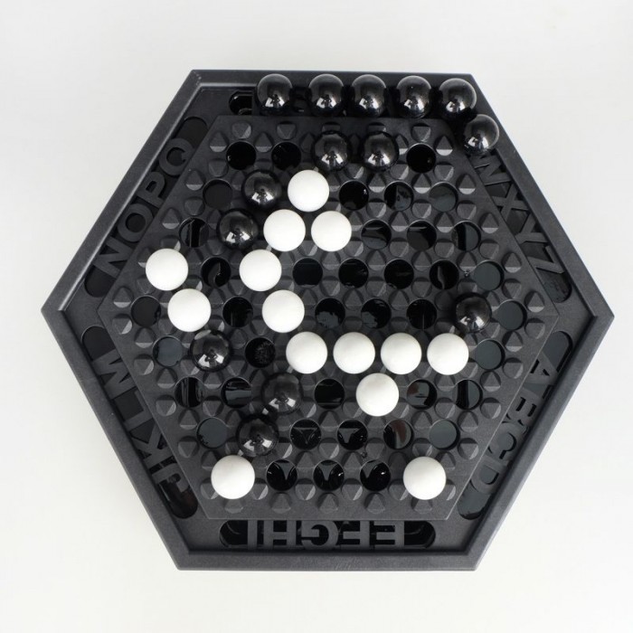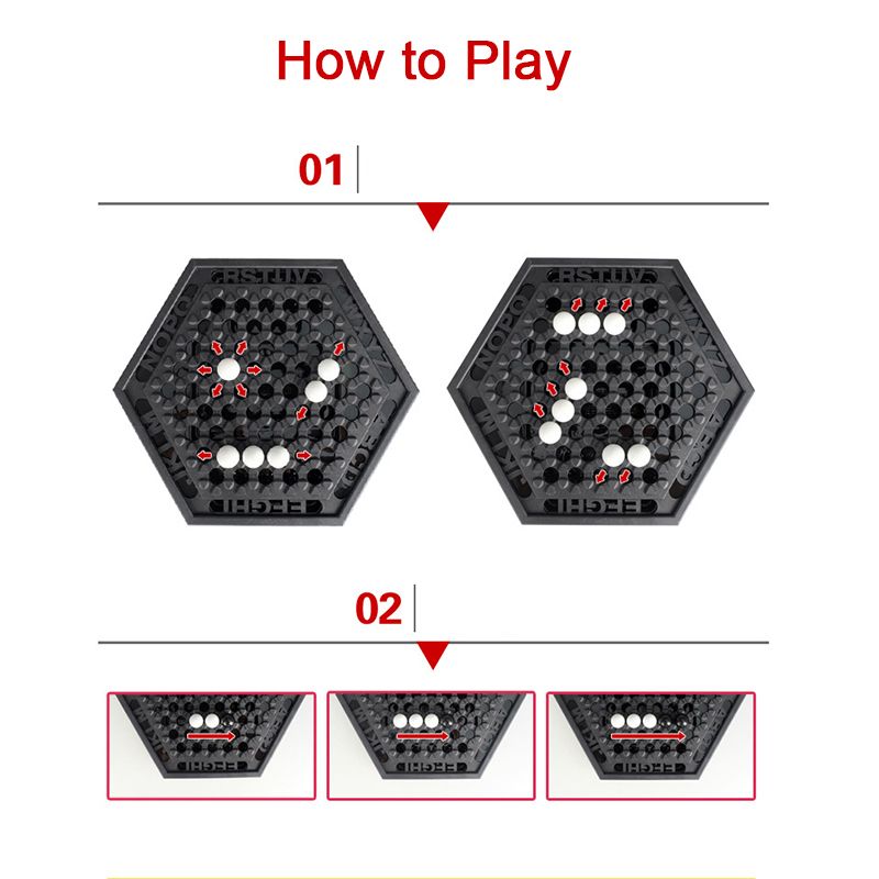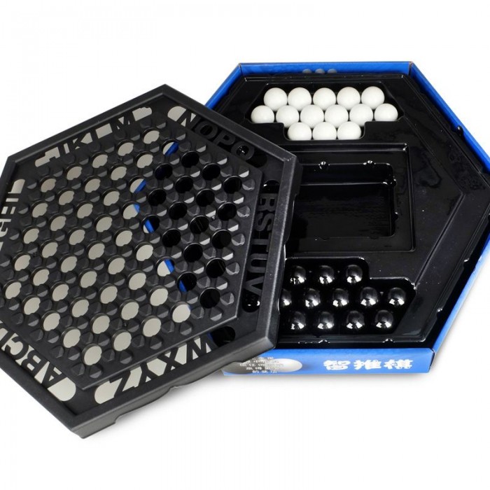 Players take turns pushing the chess pieces around the board,with the goal of pushing six of the opposing player's chess pieces off the board.