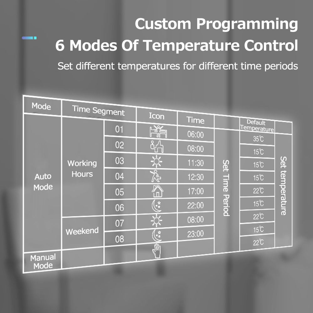 2. This thermostat adopts custom programming and has 6 modes for temperature control, which can control different temperatures according to different time periods set by the user. Perfectly control the temperature in your home, keeping