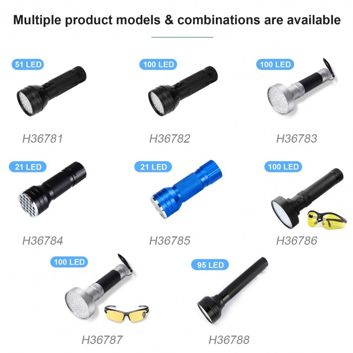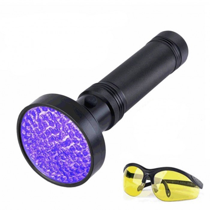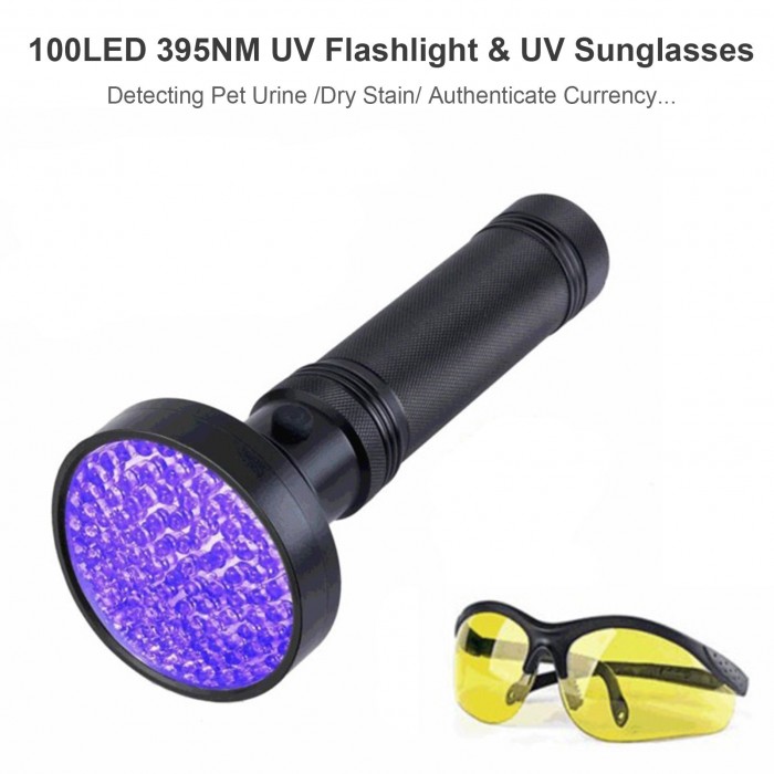 This 100 LEDs UV flashlight equipped with UV sunglasses is perfect for detecting and revealing dog, cat, rodent, and unfavorable dry stains that cannot be seen with the naked eye. As well as can be used for ink curing, currency checking, disinfection, and sterilization, etc.