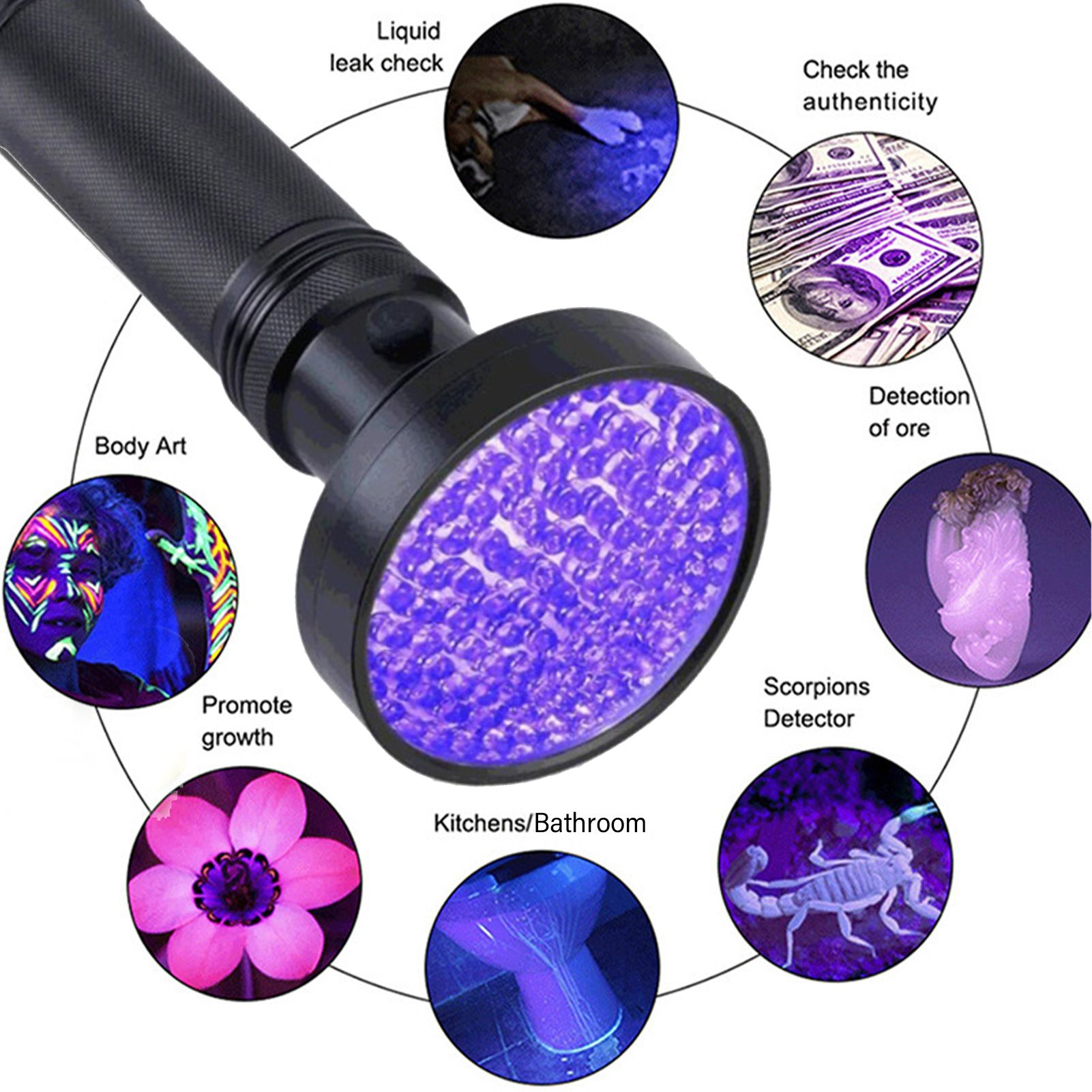 Multi-purpose: The product suit detecting scorpion and pet urine detecting. Clearly show a fluorescent agent if there is any. You may also use it to check sanitary conditions in your rooms, carpets, kitchens, toilets, authenticate currency, check the residues on clothes and metal & cracks detecting, etc.