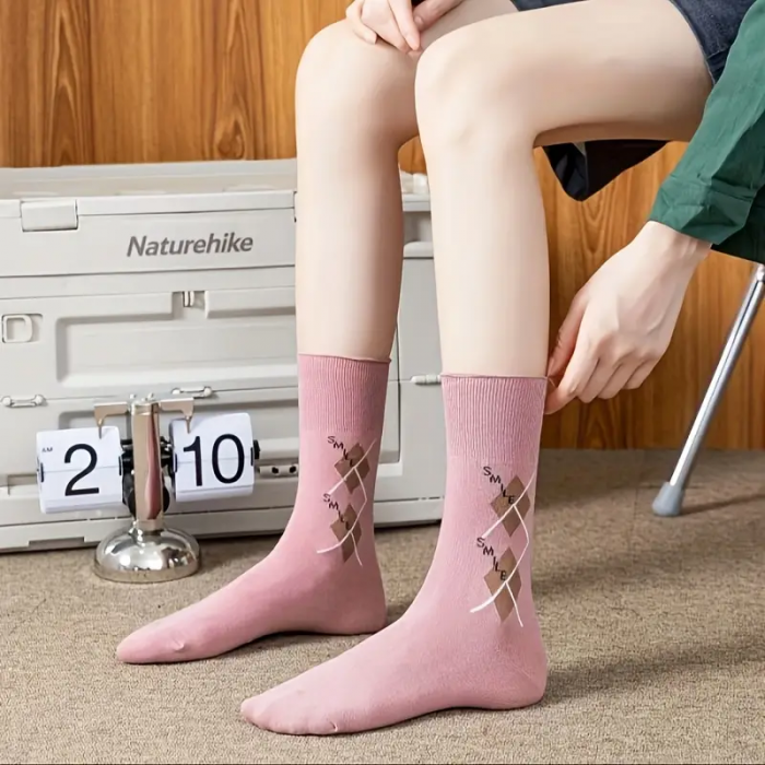 5 Pairs Argyle Pattern Socks, Retro & Warm Mid Tube Socks, Women's Stockings & Hosiery